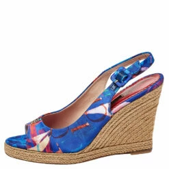 Carolina Herrera Blue Multicolor Floral Printed Fabric And Leather Ankle Strap Sandals Size 39 Women