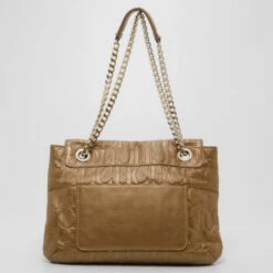 From Carolina Herrera’s romantic and glamours A/W 2011 collection, the Audrey is a charming handbag that you will just love to carry. Crafted from monogram metallic gold leather, it is detailed with a large bow, chain link shoulder straps and gold hardware. The spacious black fabric lined interior features a zip pocket.
