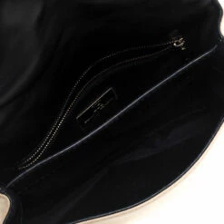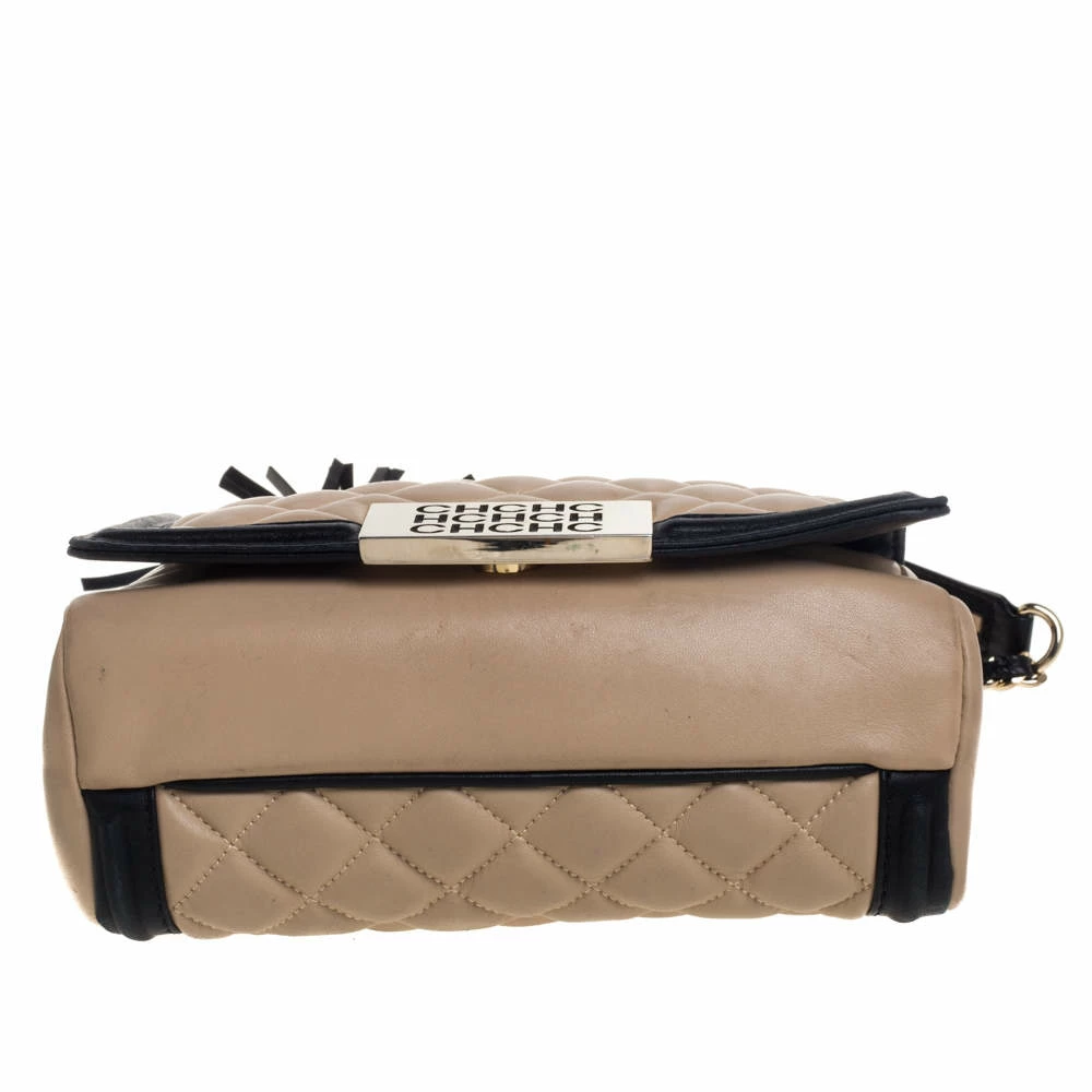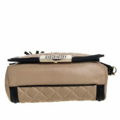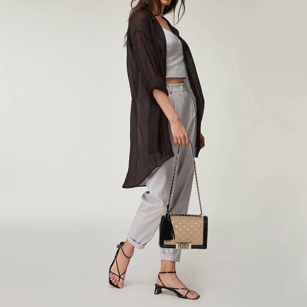 Carolina Herrera’s refined feminine sensibilities come alive in this stunning shoulder bag. Crafted from leather in a quilted design, it features a front flap outlined in a black shade and tassels that hang from the chain-leather belt. The creation is finished off with a logo plate on the front.