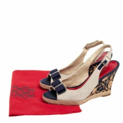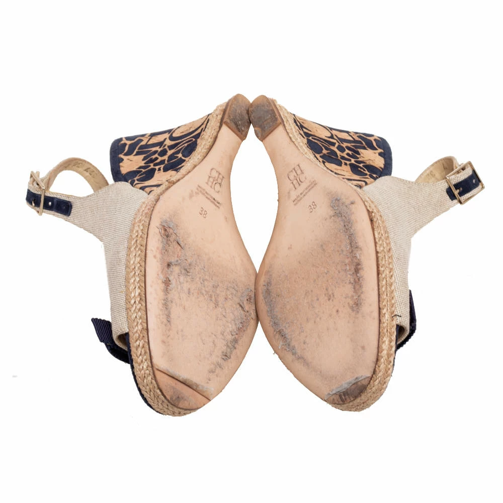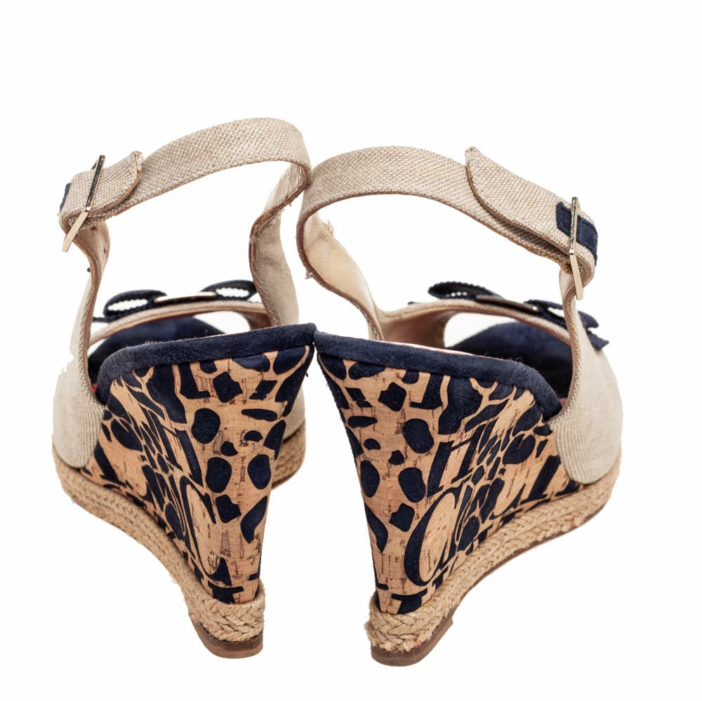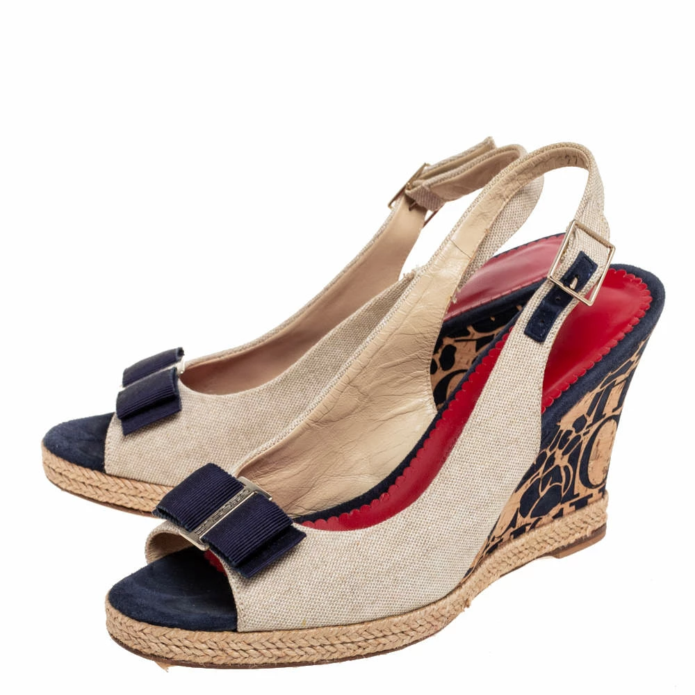 Amp up your style quotient as you step into these gorgeous sandals from the House of Carolina Herrera. They are created using beige canvas and feature cork wedge platforms. They come with gold-toned hardware, a bow motif on the toes, and a slingback.