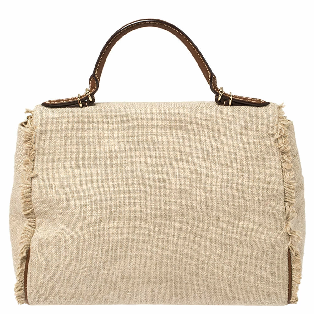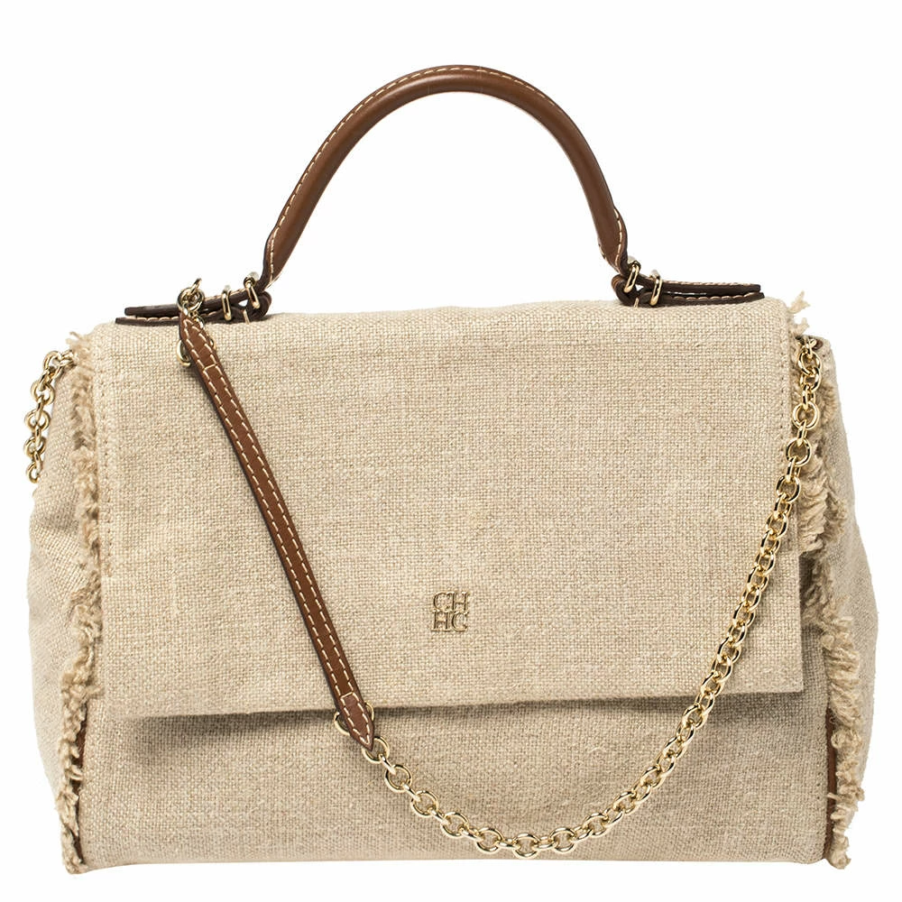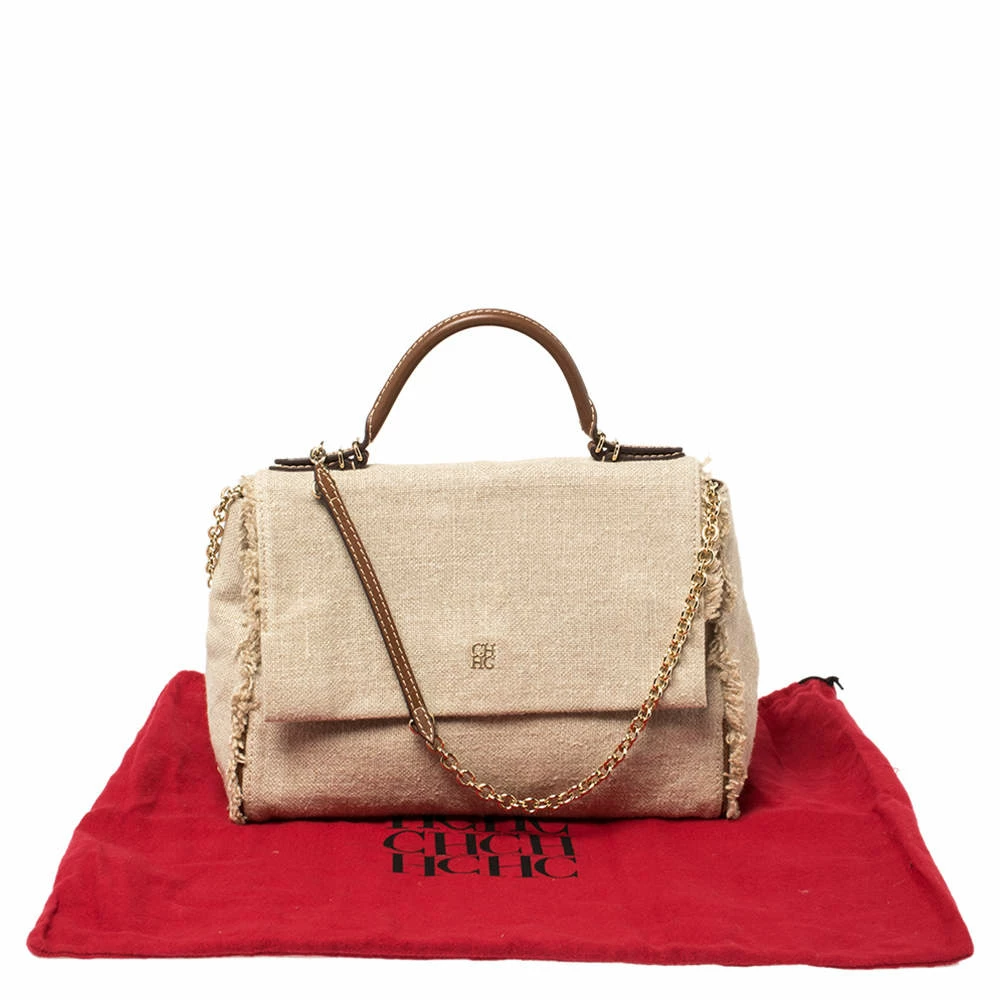 This Minuetto bag from the house of Carolina Herrera is something you would go to season after season. It has been crafted from a beige canvas body and features a smooth flap style. It comes with a chain shoulder strap in addition to a top handle. It has a subtle slouch to the structure and opens to a spacious interior that can easily hold your day to evening essentials.