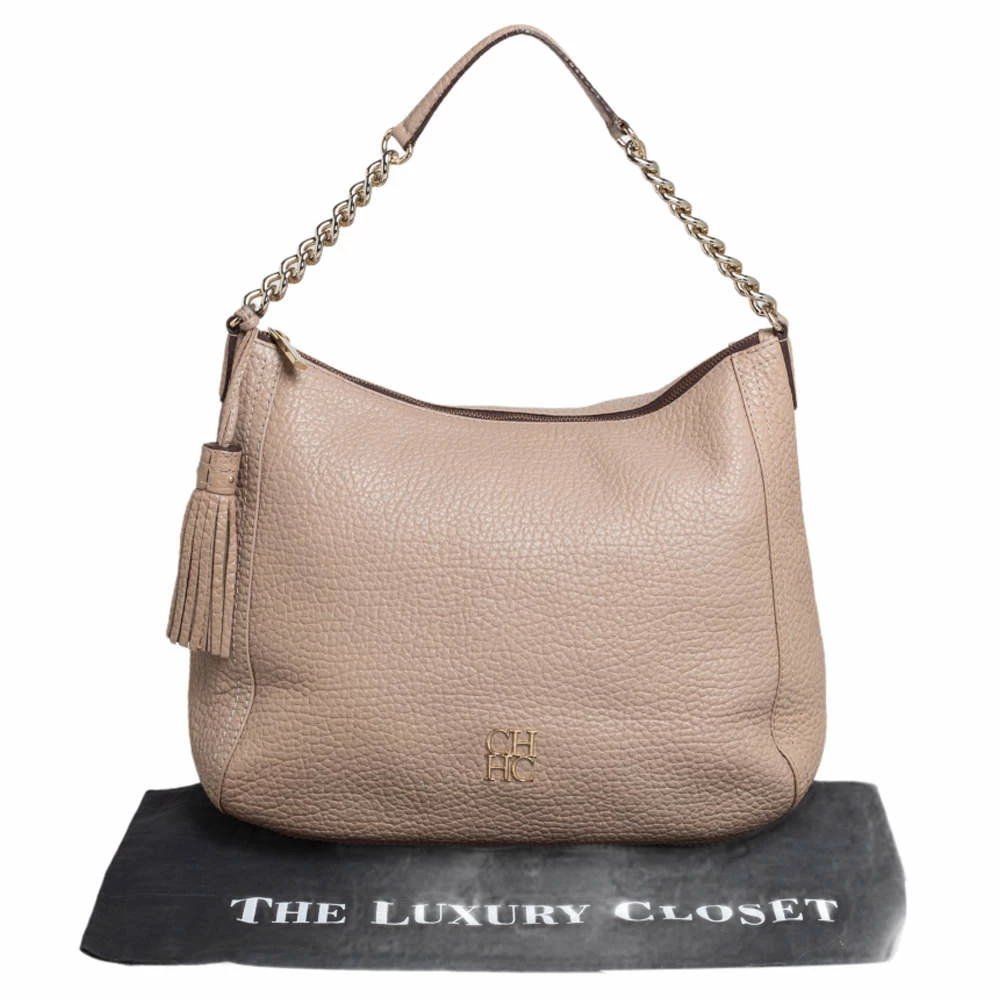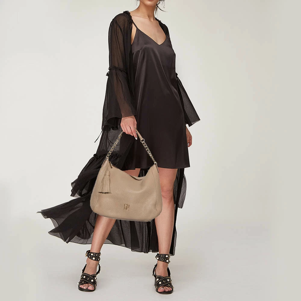 Designed from beige leather, this Carolina Herrera hobo will go well with your everyday style. It has a zip-enclosed fabric interior, a tassel charm, and a single chain-leather handle.