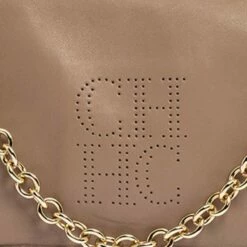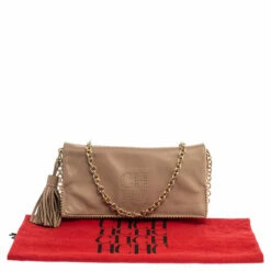This Carolina Herrera bag exudes style, modernity, and class in equal measures. It comes crafted from beige leather and styled with a front flap that carries perforated brand logo details. It opens to a suede-lined interior and is held by a chain-link that carries an attached tassel charm.