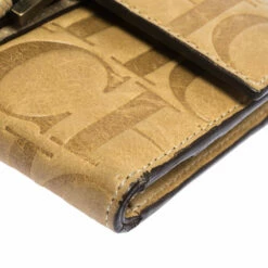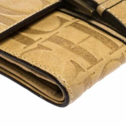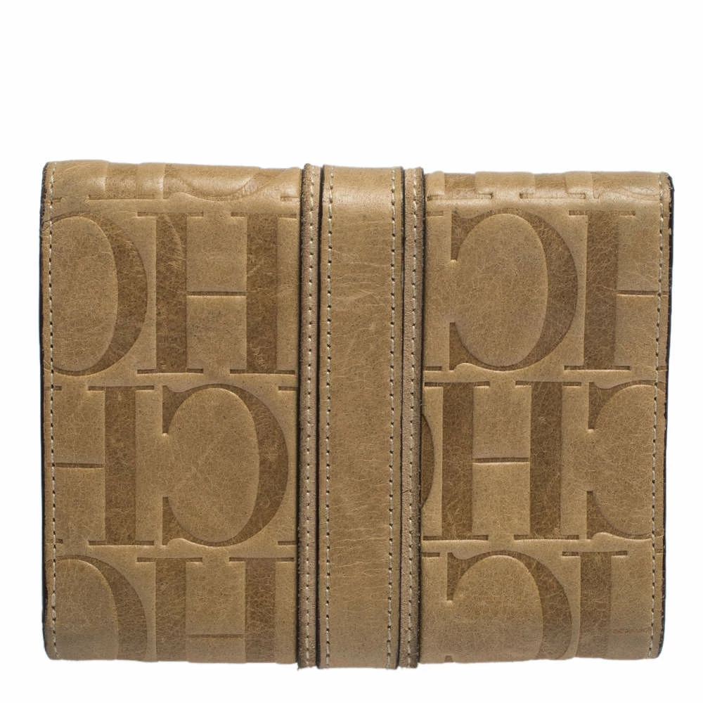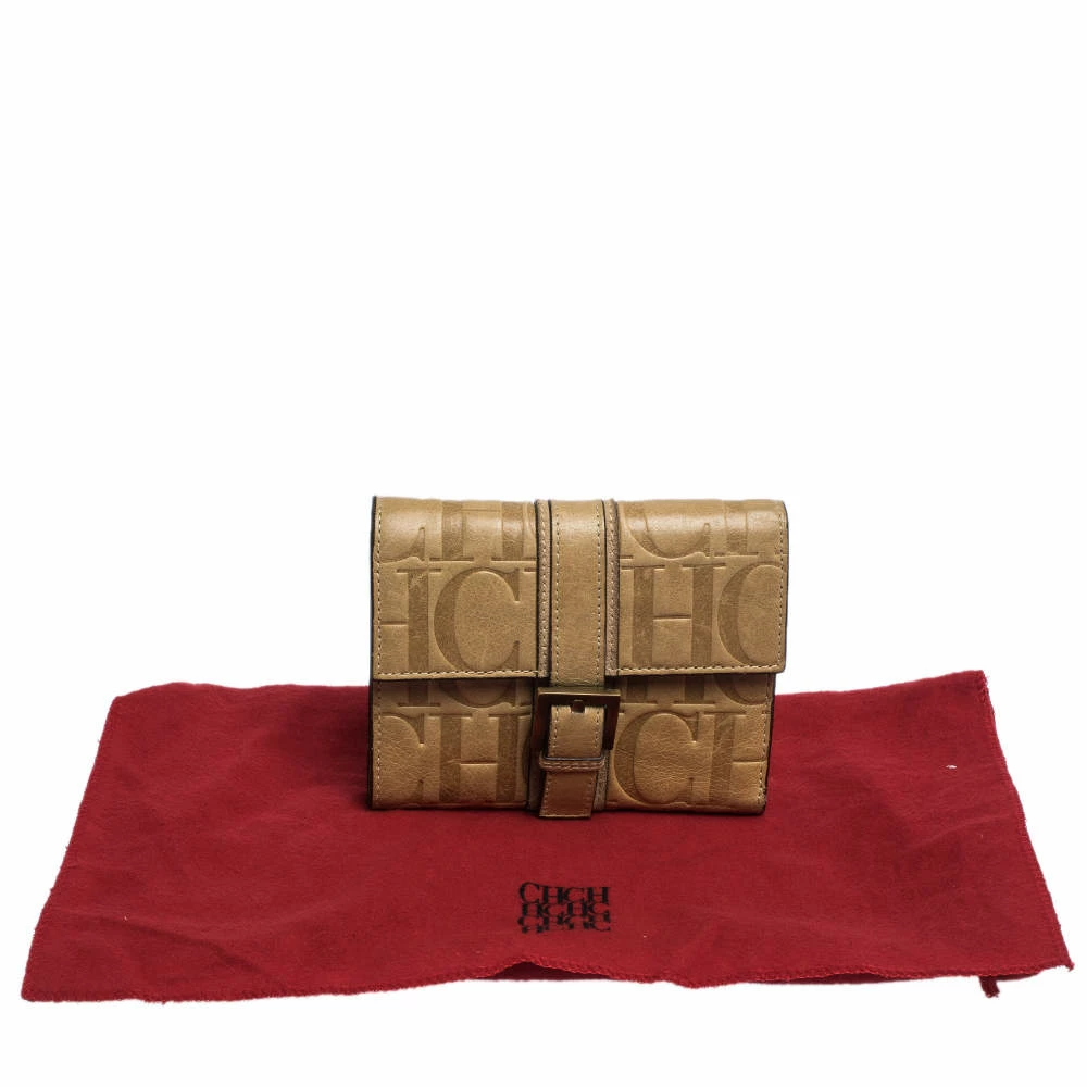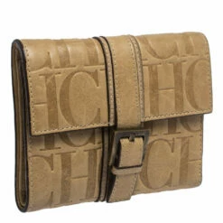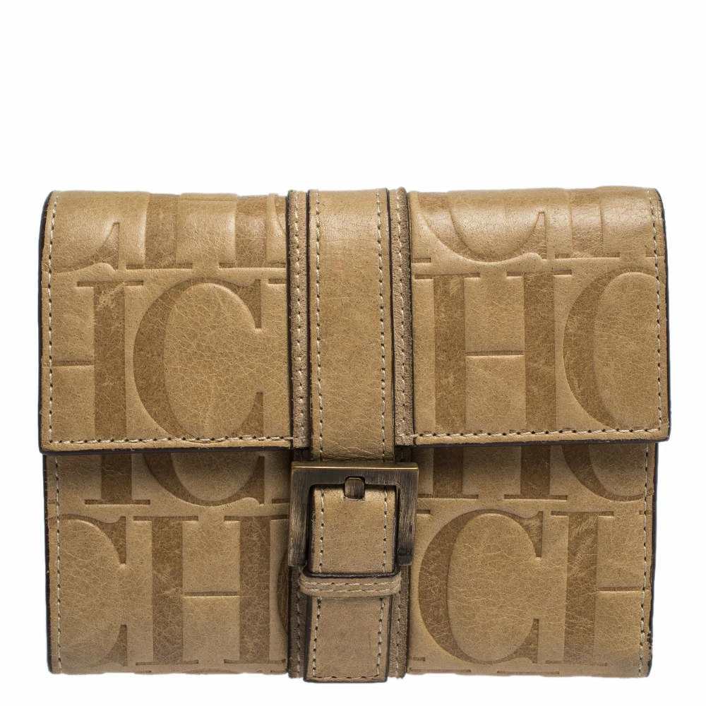Basic essentials can be carried effortlessly in this compact wallet from the extraordinary house of Carolina Herrera. Add a touch of chic style to your wardrobe with this wallet crafted from beige monogram leather. It has a buckled front flap that opens to a spacious interior with multiple slots and compartments. It is finished with bronze-tone hardware.