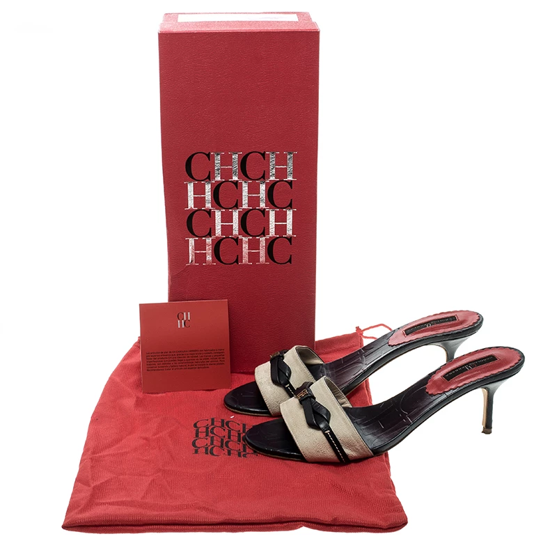 How lovely are these mules from Carolina Herrera! They come designed with suede front straps detailed with little CH leather bows. Open toes, leather insoles and 6.5 cm heels complete this must-have pair.