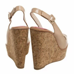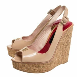 These lovely Carolina Herrera sandals will bring you the right amount of style and shine. They are made of beige patent leather and feature peep toes, gold-tone logo detailing on the vamps, slingbacks, and 13 cm cork wedge heels. They are pretty and easy to flaunt.