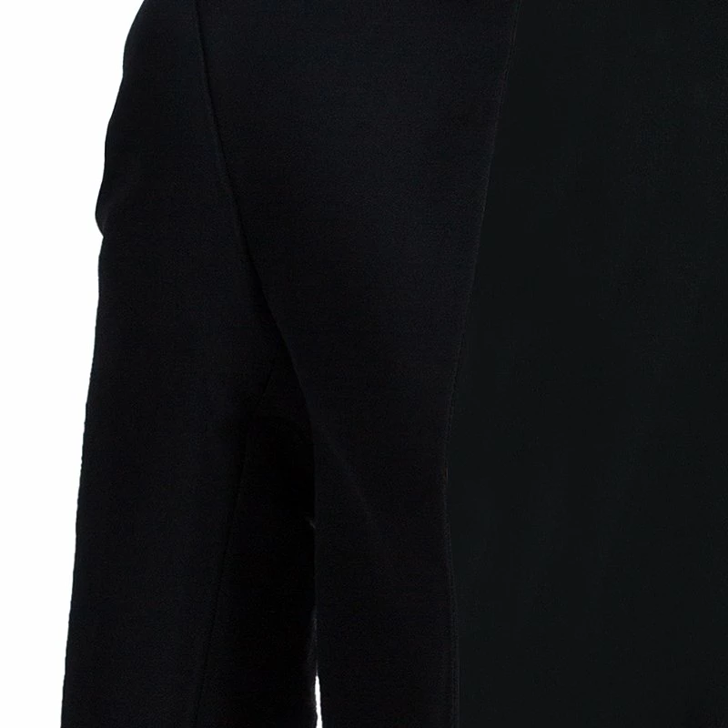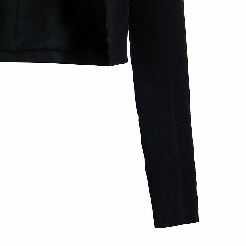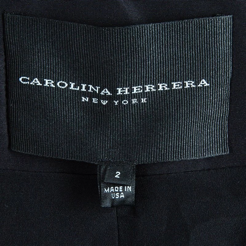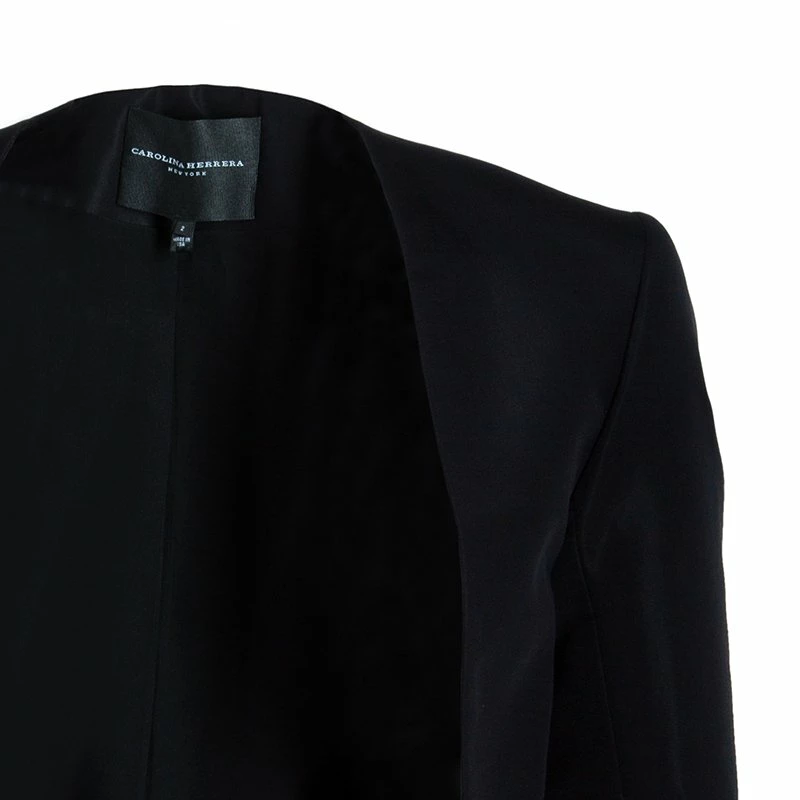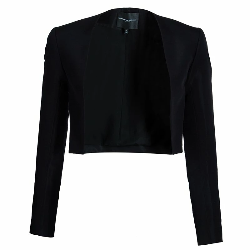Cropped jackets are a cool way to add a distinguished style to your appearance. This brilliant crop jacket by Carolina Herrera comes crafted in black silk. It features button detailed full sleeves and an open front. Layer this over baggy or fitted tops for a truly stylish look.