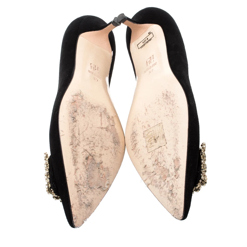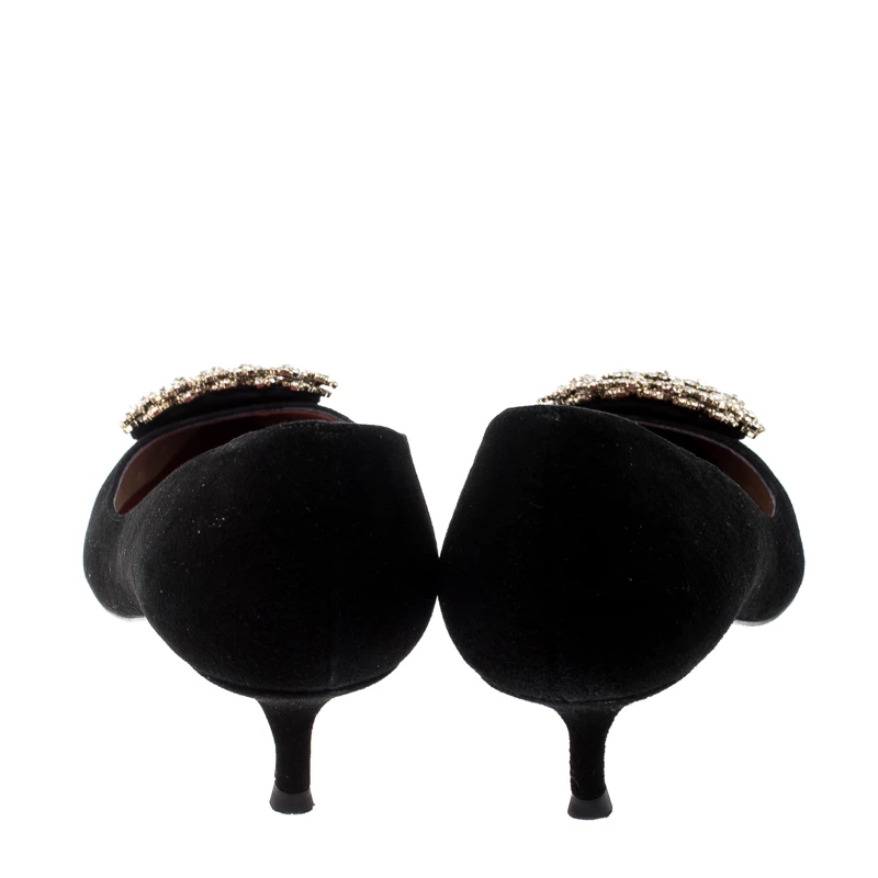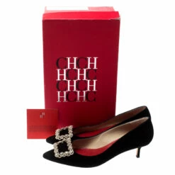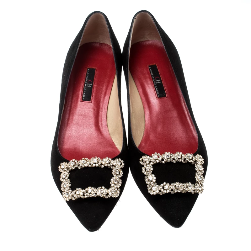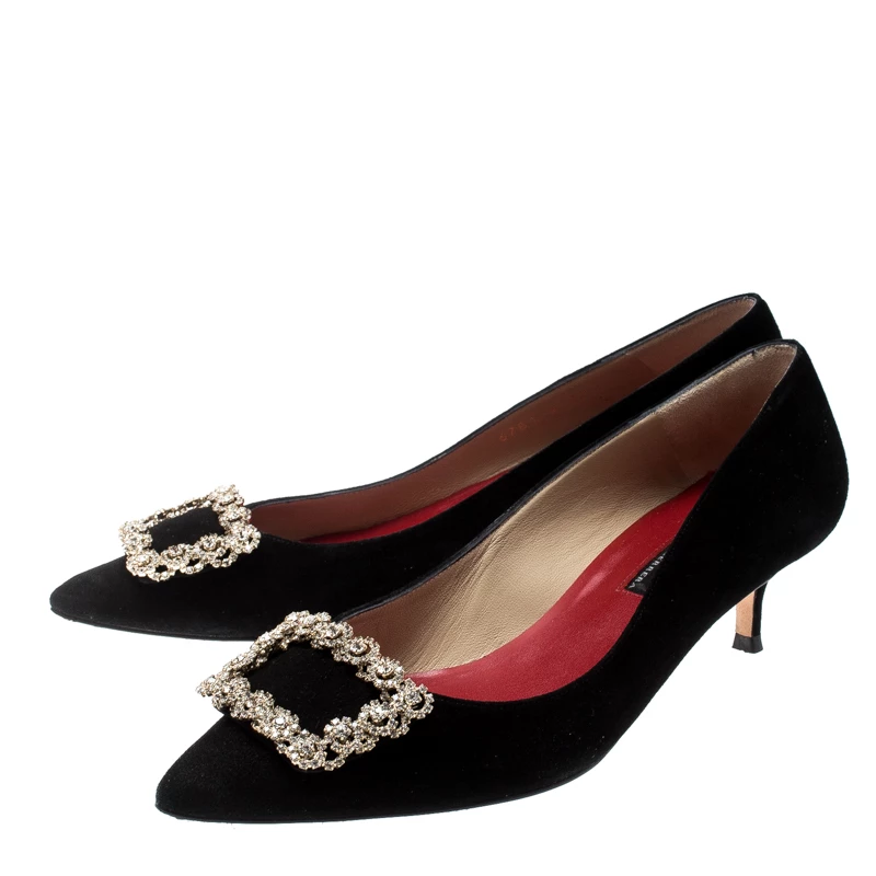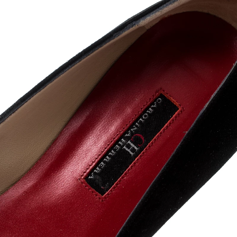 These glamorous Carolina Herrera pumps have a crystals encrusted buckle on the vamps. The pair is crafted from suede in a rich black hue with pointed toes. They come with leather insoles and kitten heels.