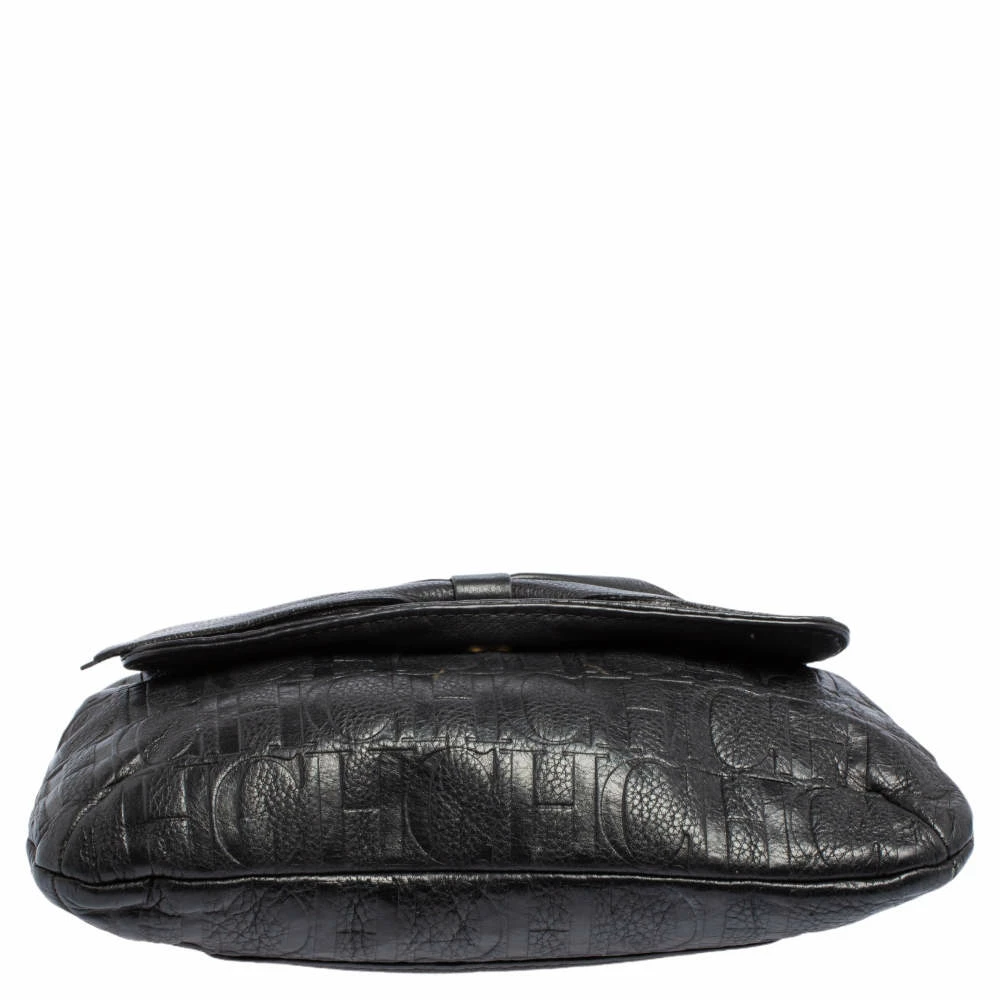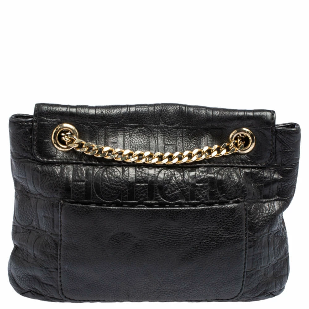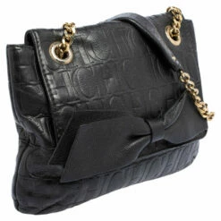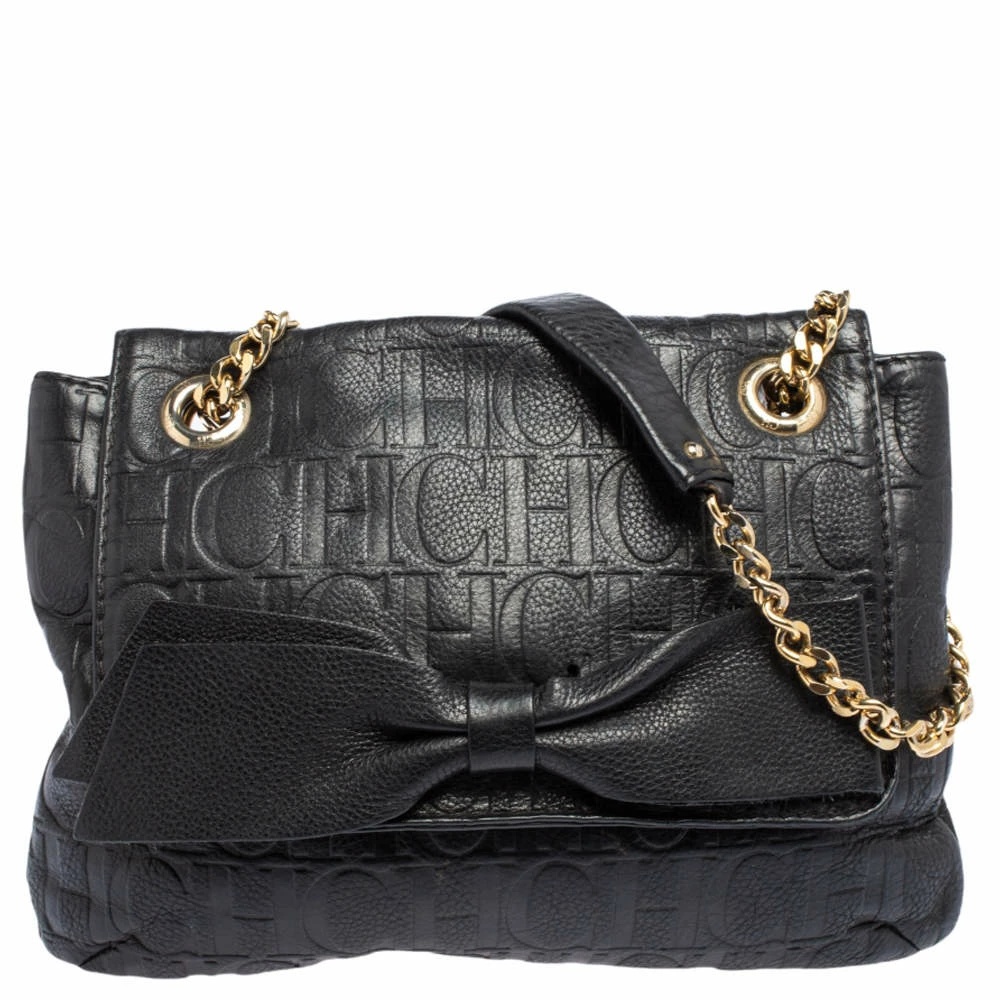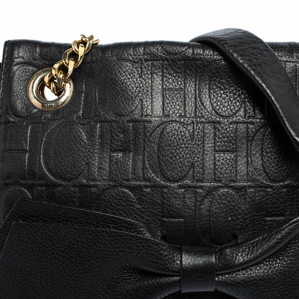 This adorable flap bag by Carolina Herrera is crafted from black leather. Highlighted with a bow on the flap, it features the brand monogram embossed all over and comes with a chainlink shoulder strap and a canvas-lined interior with a zip pocket on the inside.