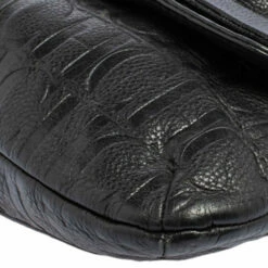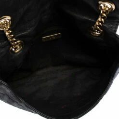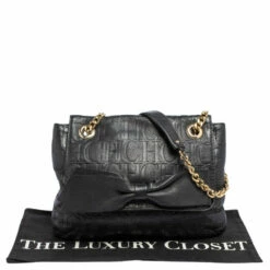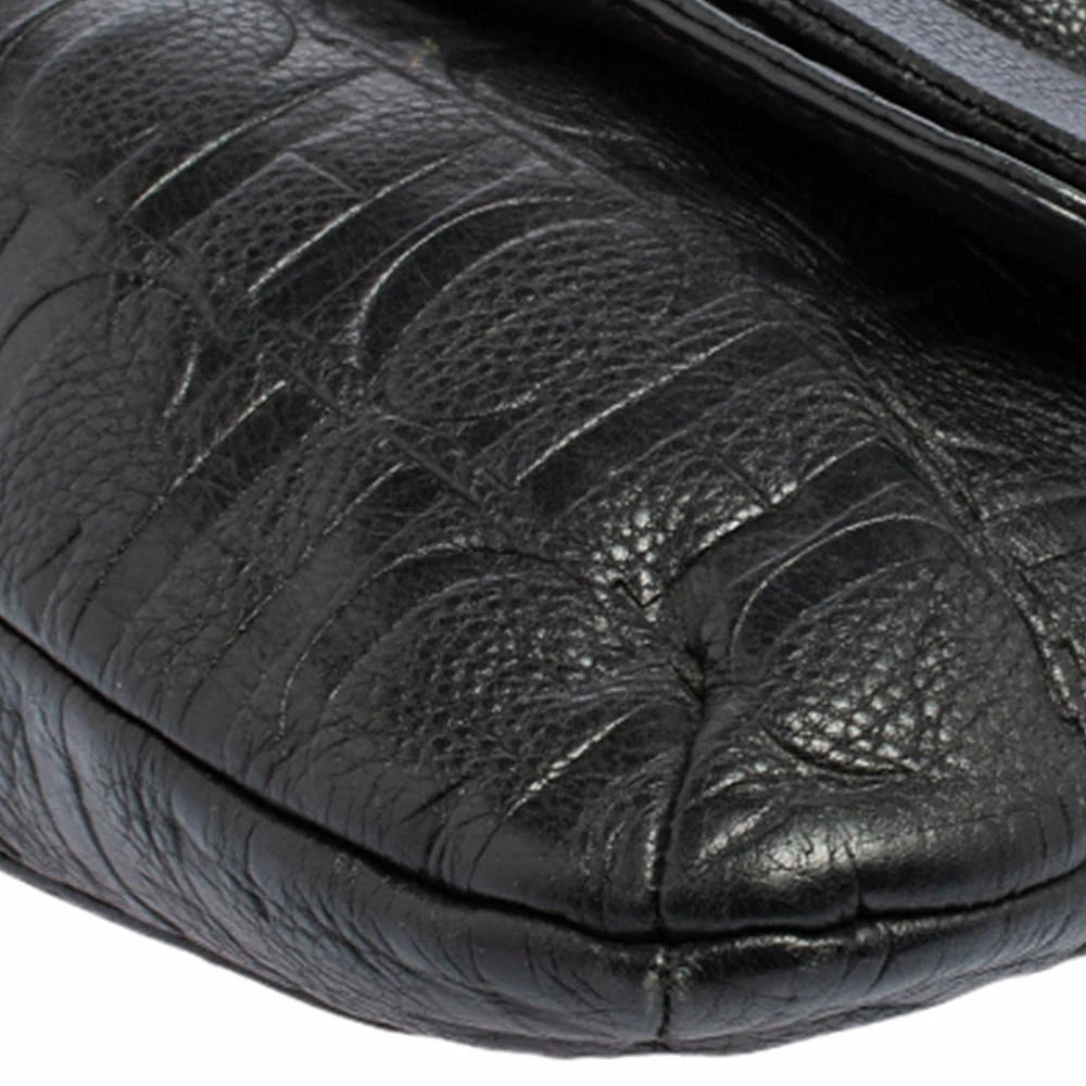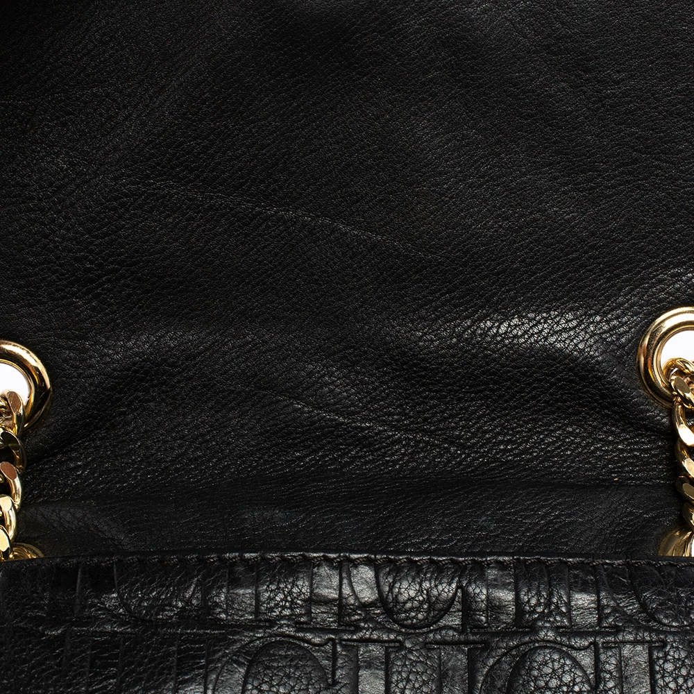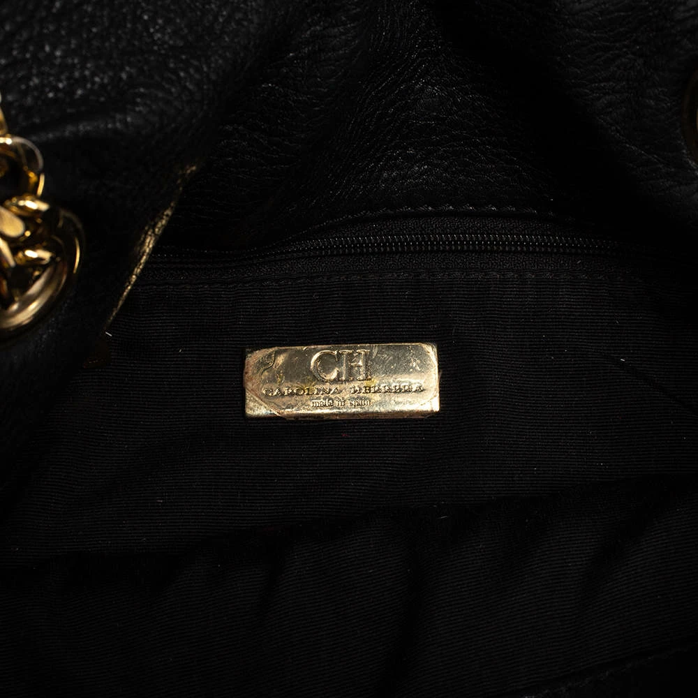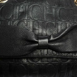 This adorable flap bag by Carolina Herrera is crafted from black leather. Highlighted with a bow on the flap, it features the brand monogram embossed all over and comes with a chainlink shoulder strap and a canvas-lined interior with a zip pocket on the inside.