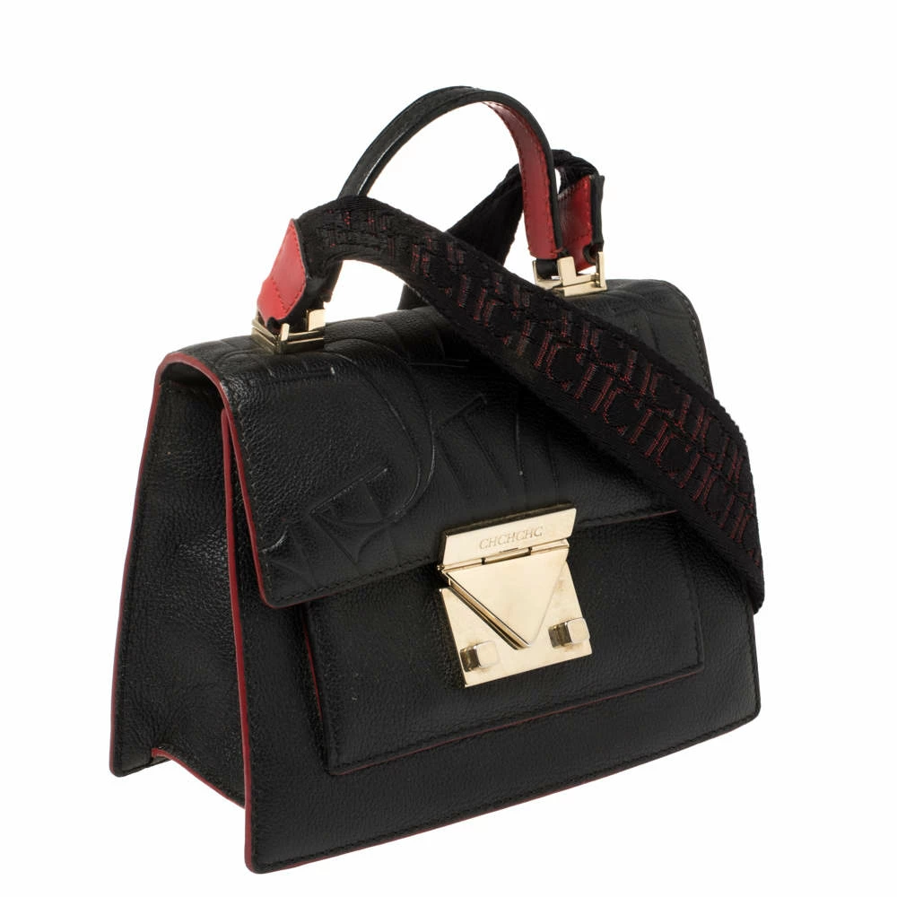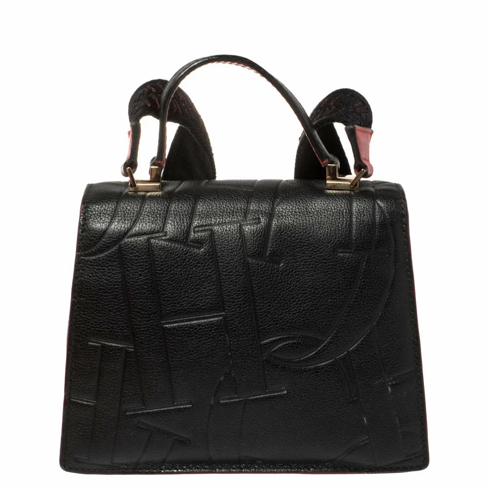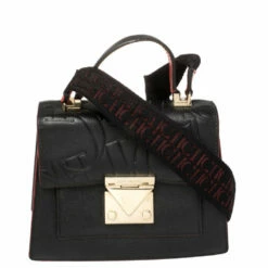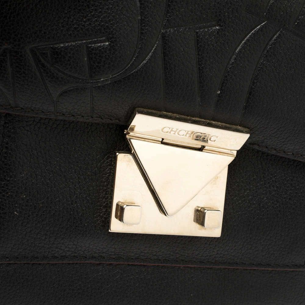 This stylish bag is perfect for day and night ensembles. Carolina Herrera has crafted this bag from leather in a black hue. It has logo embossing on the exterior, a front flap with a push lock fastening, a top handle, a compact interior, and gold-tone hardware.