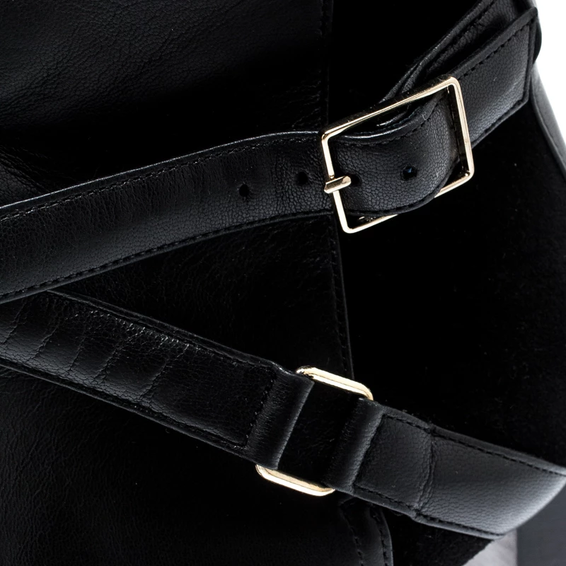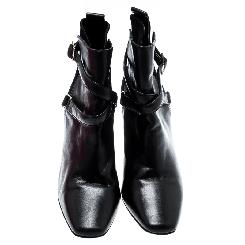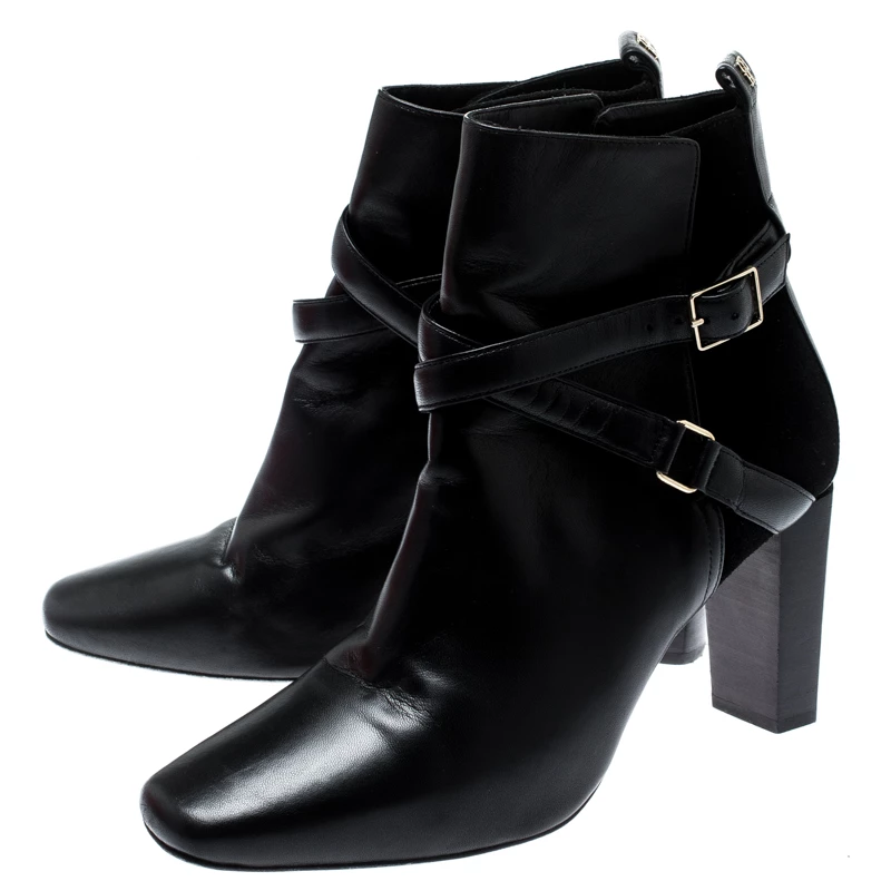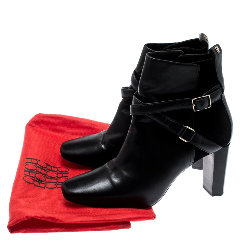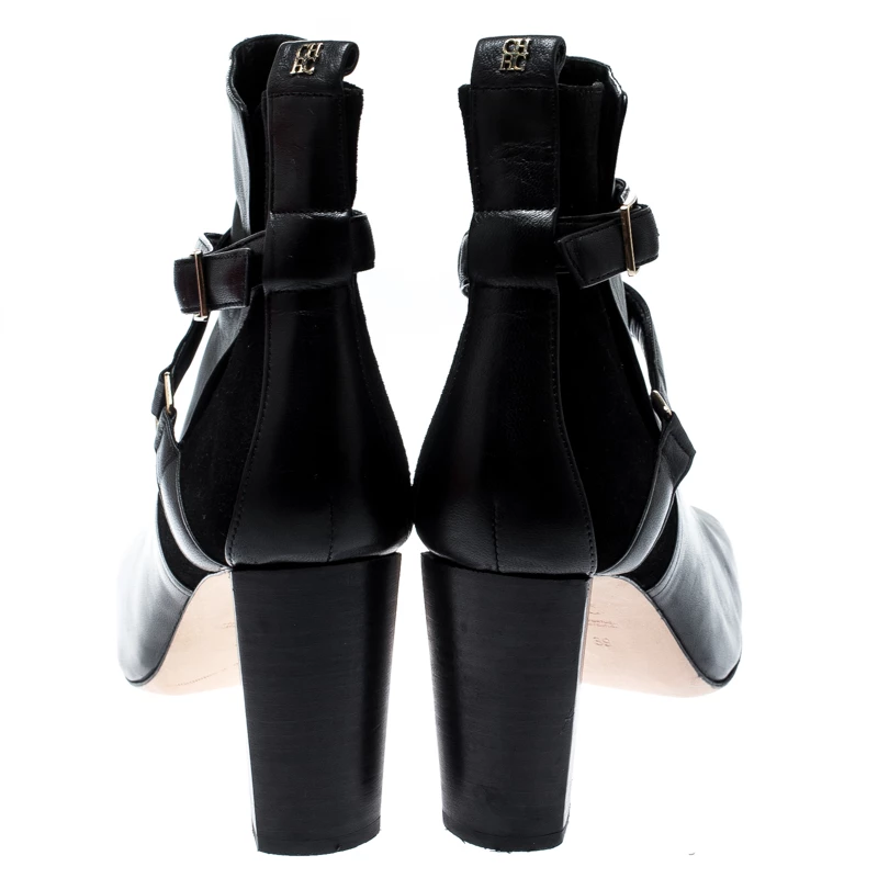 These Carolina Herrera ankle boots made from leather and suede are edgy and sleek at the same time. They have been styled beautifully with buckle cross straps and block heels. They are durable and fashionable.