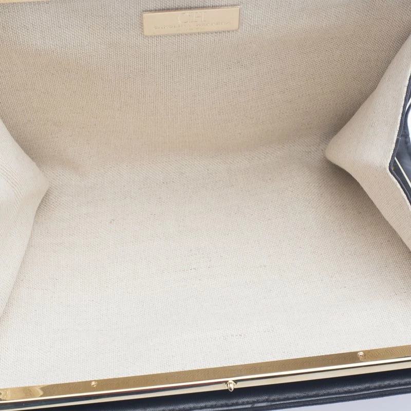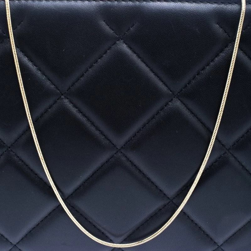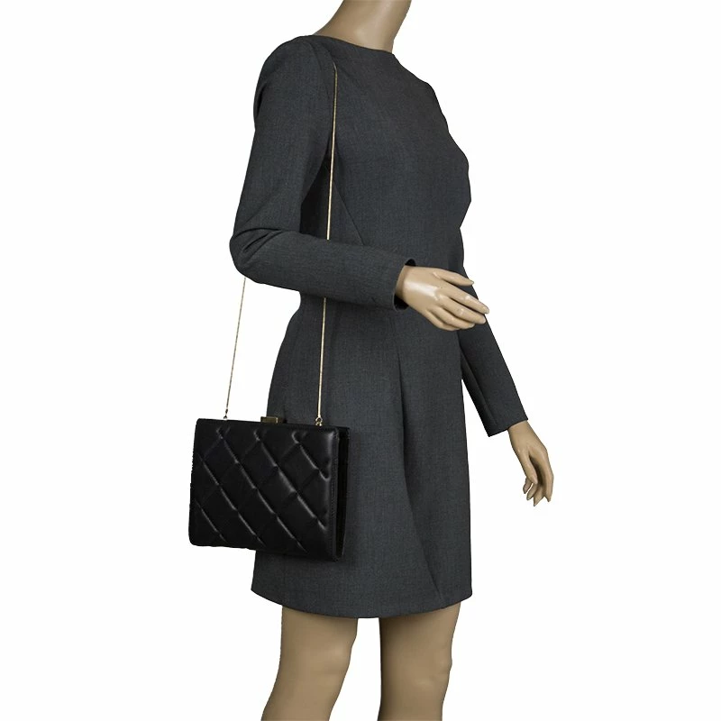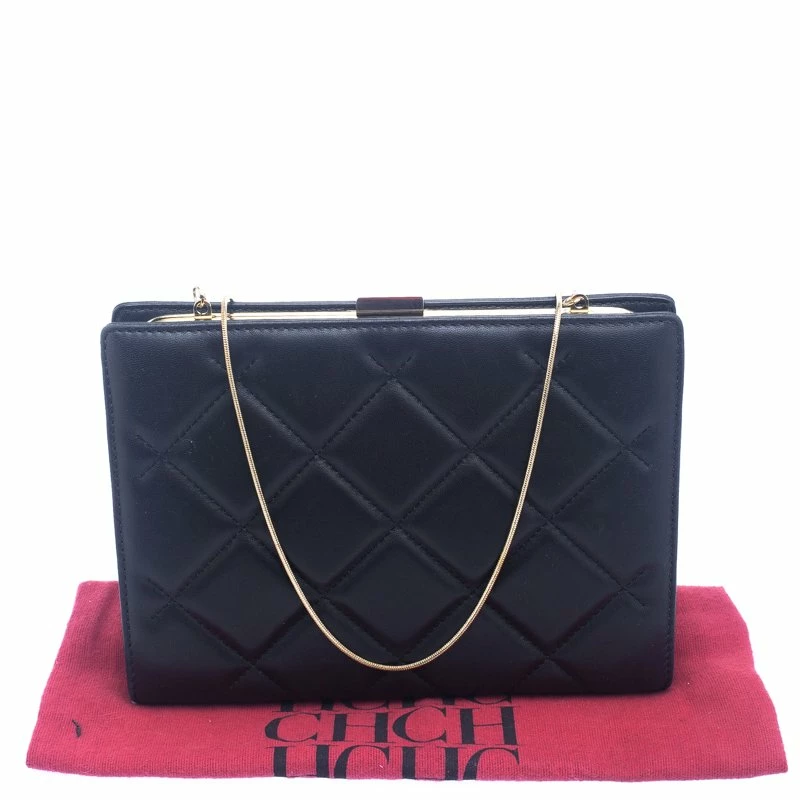 This Carolina Herrera clutch is crafted from black leather and has a feminine design. The lovely clutch features a chain strap and the lock closure opens to a canvas lined interior that will keep your party essentials close at hand. Pair it with a dress and metallic heels to make heads turn.