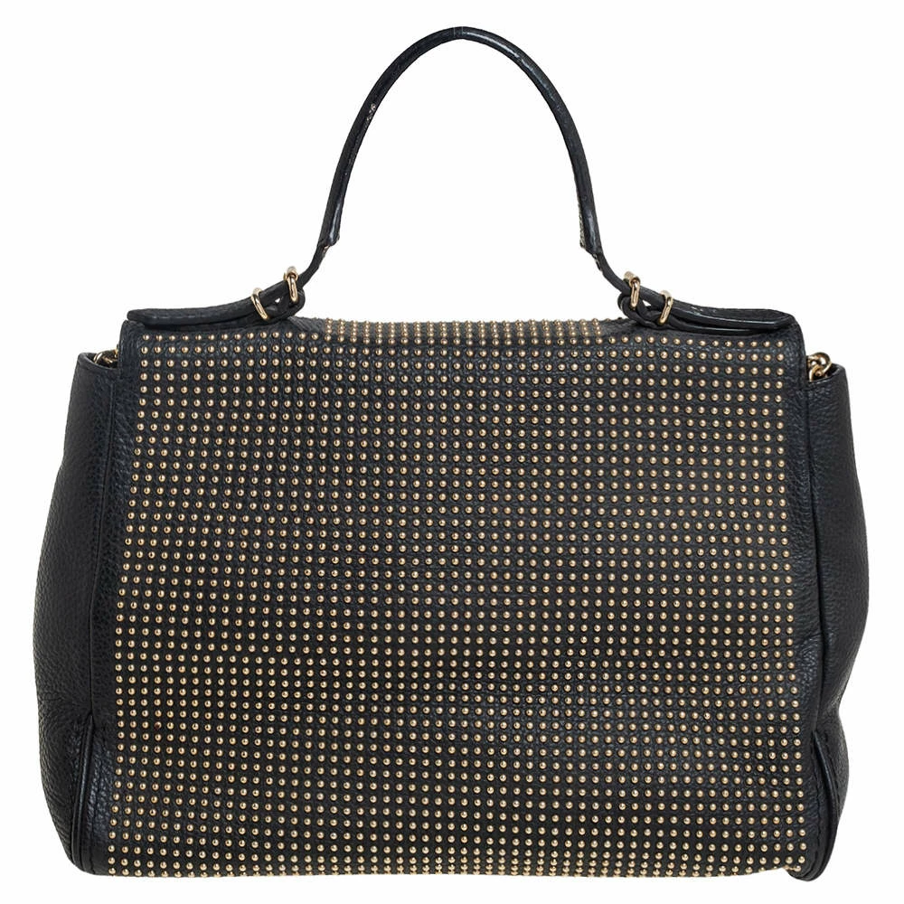 This Minuetto bag from the house of Carolina Herrera is something you would go to season after season. It has been crafted from a versatile black leather body featuring stud embellishments all over and a flap style. It comes with a chain shoulder strap in addition to a flat top handle. It has a subtle slouch to the structure and opens to a spacious interior that can easily hold your day to evening essentials.