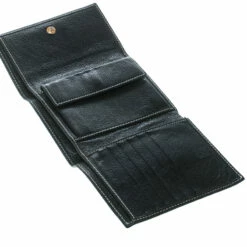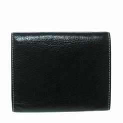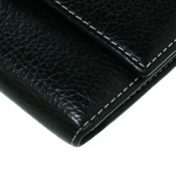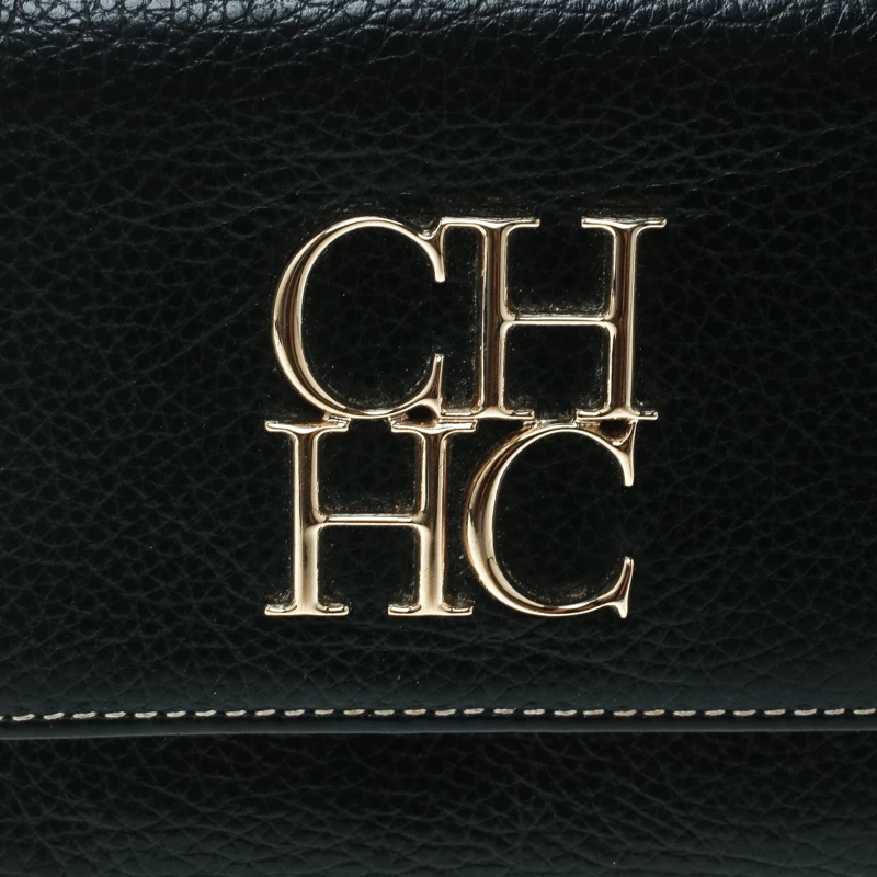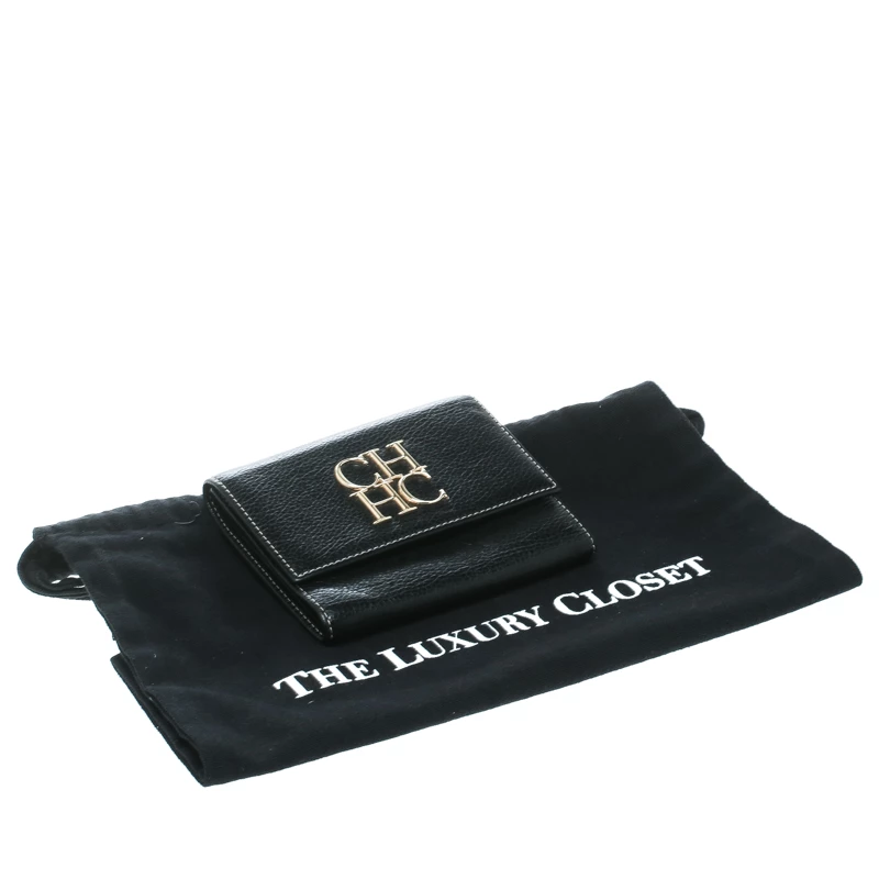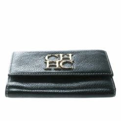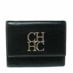 Featuring a black, subtly textured, leather body, this wallet from Carolina Herrera has a flap style secured with a snap button closure. It opens to a neatly organized interior fitted with multiple slots, slips pockets and flap pouch to secure little essentials. It features the iconic ‘CHCH’ logo making it instantly recognizable.