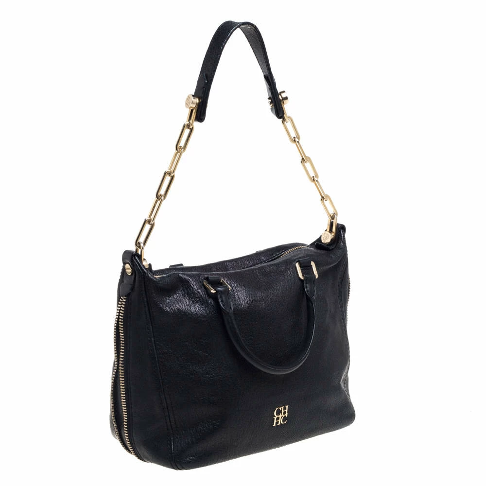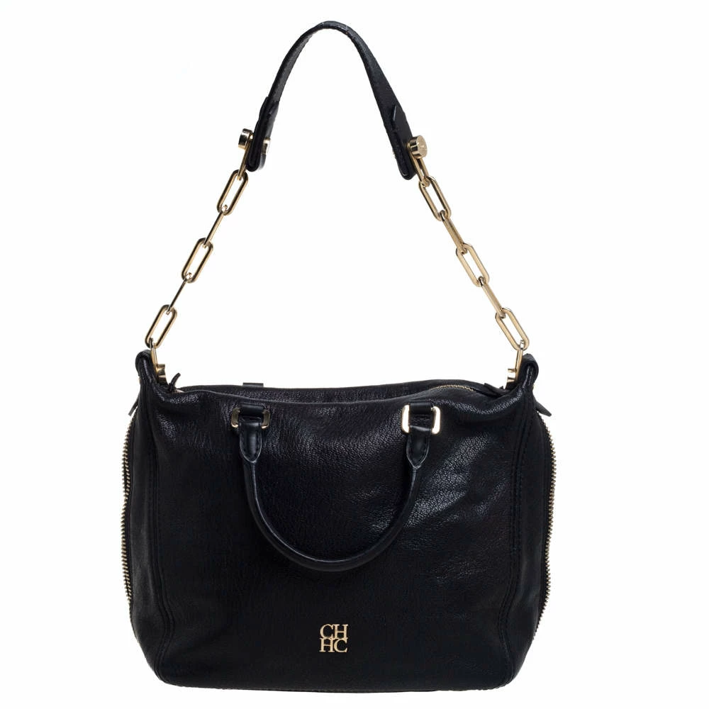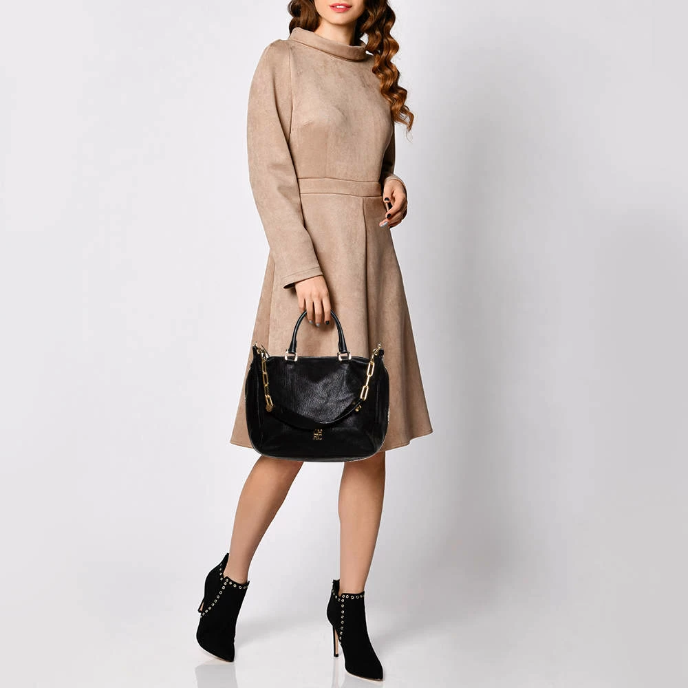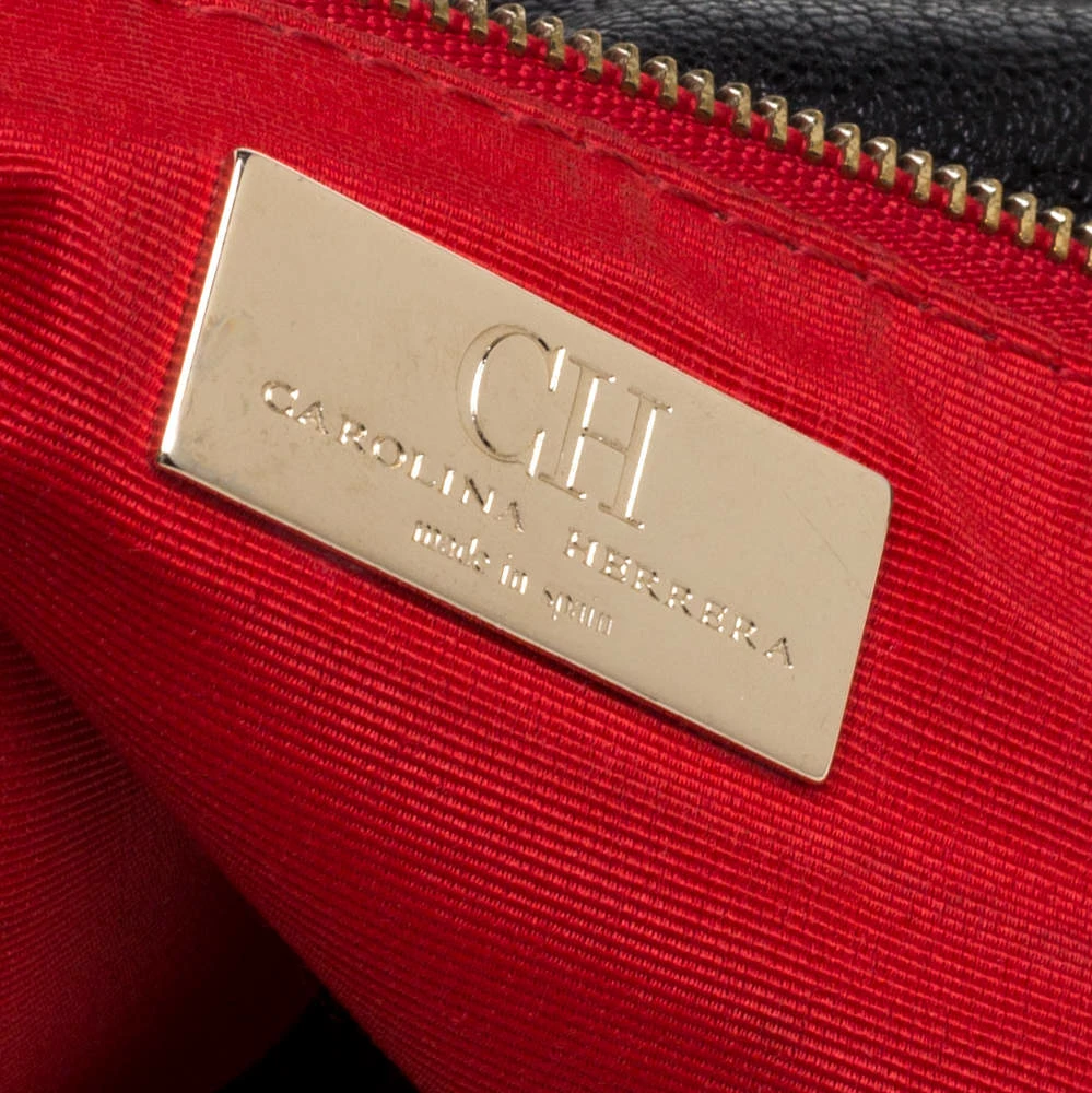 Stunning in appeal and simple in design, this satchel by Carolina Herrera will be a valuable addition to your closet. Crafted from black leather, the bag features zip accents on the contours, twin handles, and a shoulder strap. The zip closure opens to a spacious fabric-lined interior that will hold all your belongings. It is complete with brand detailing on the front.