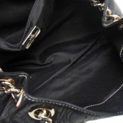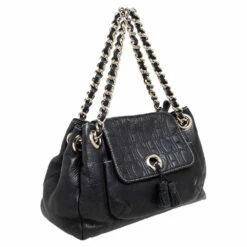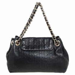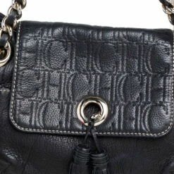 This adorable flap bag by Carolina Herrera is crafted from black leather. Highlighted with tassels on the flap, it features monogram embossing all over and comes with chainlink shoulder straps and a nylon-lined interior with enough space for essentials.