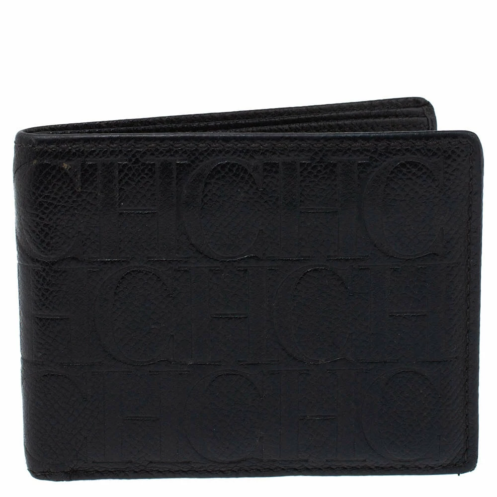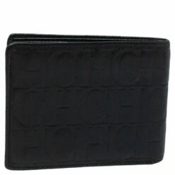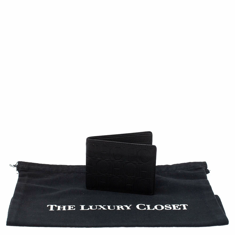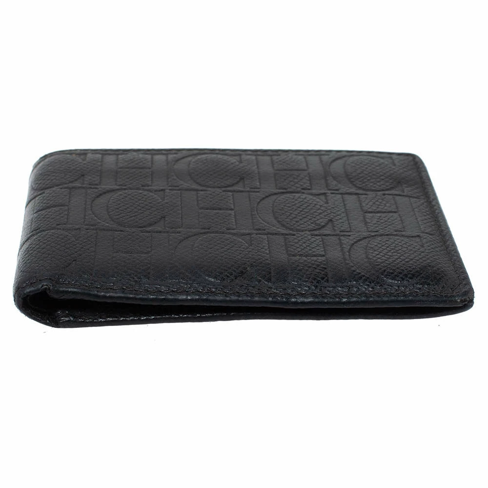 This Carolina Herrera bi-fold wallet is the most classy way to organize your essentials. The stunning black leather creation is adorned with the brand logo embossing all over and features a main compartment and multiple card slots to keep your cards and cash in place.
