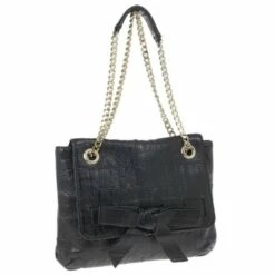 This Audrey bag from Carolina Herrera’s collection is a charming handbag that you will just love to flaunt. Crafted from black CH monogram leather, the exterior is accented with a leather bow and embossed with the CH logo, and designed with a back pocket. Its engraved eyelets hold the oversized chain handle that features a shoulder pad and can be transformed into a shoulder strap. Lined with canvas, this beauty has a magnetic snap closure and includes one zipped pocket.