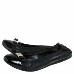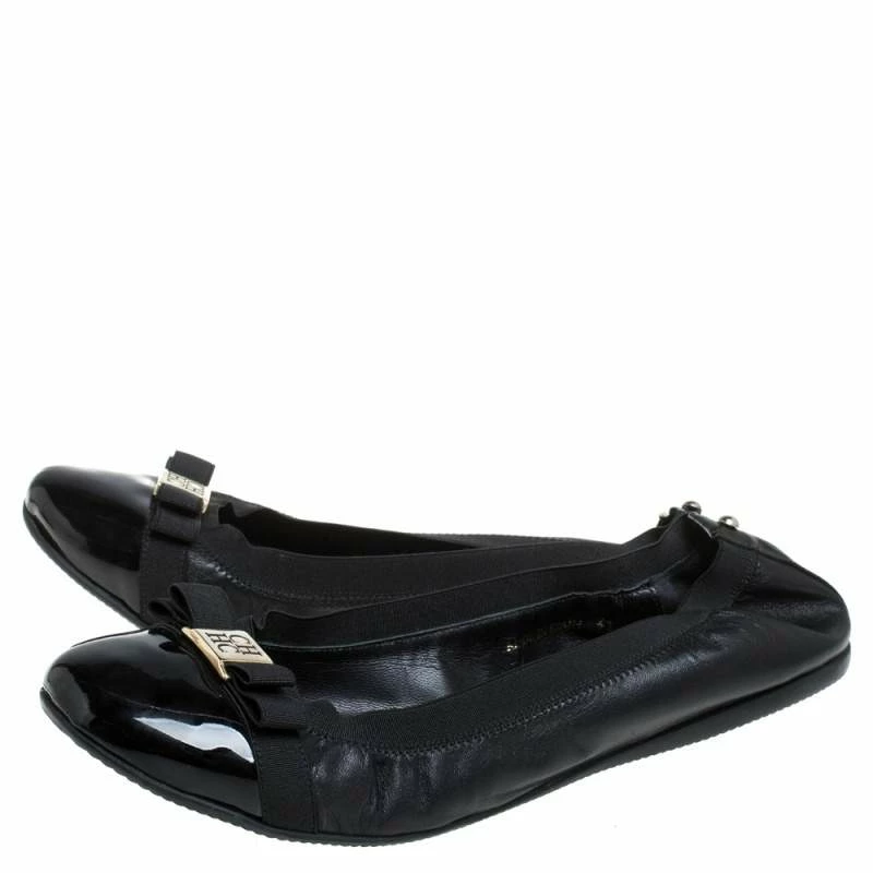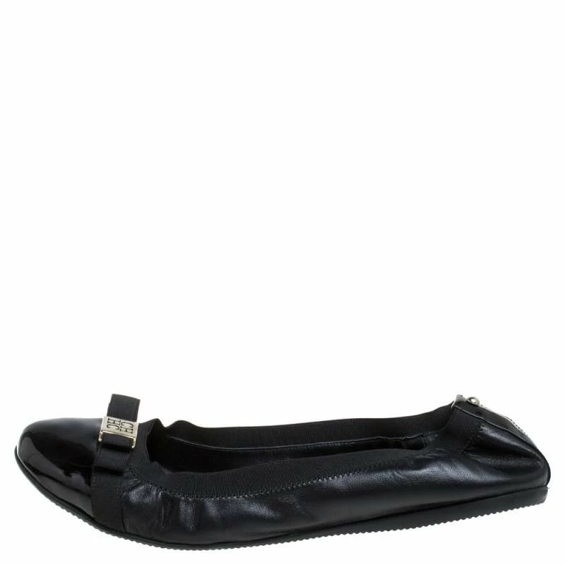 Beautiful and sophisticated, these ballet flats from Carolina Herrera will prove to be a perfect alternative to your party heels. Rendered in black leather, the pair is styled with patent leather cap toes featuring logo-detailed bows and elastic trims. Complete with rubber soles, team them with your flowy skirts for a pretty look.