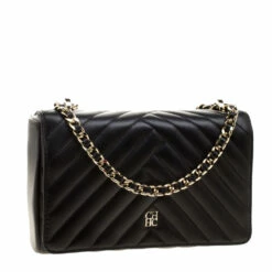 Parade this petite flap bag from Carolina Herrera to flaunt your exiquiste style. Designed with leather in quilted style, the CHHC signature in gold-tone hardware accentuates the finesse of the classic black base. Supported by a chain-leather shoulder strap, the interior of the bag is equipped with nylon lining and a zip pocket.