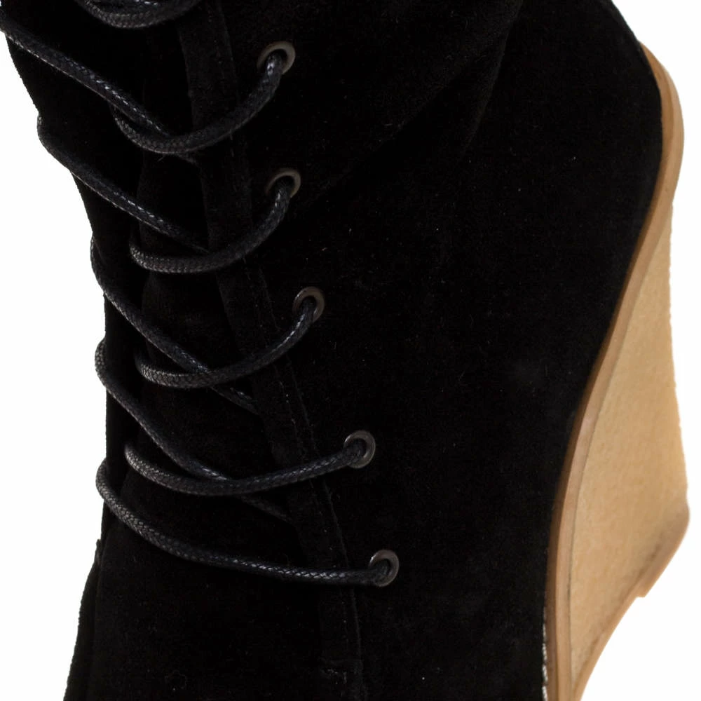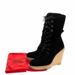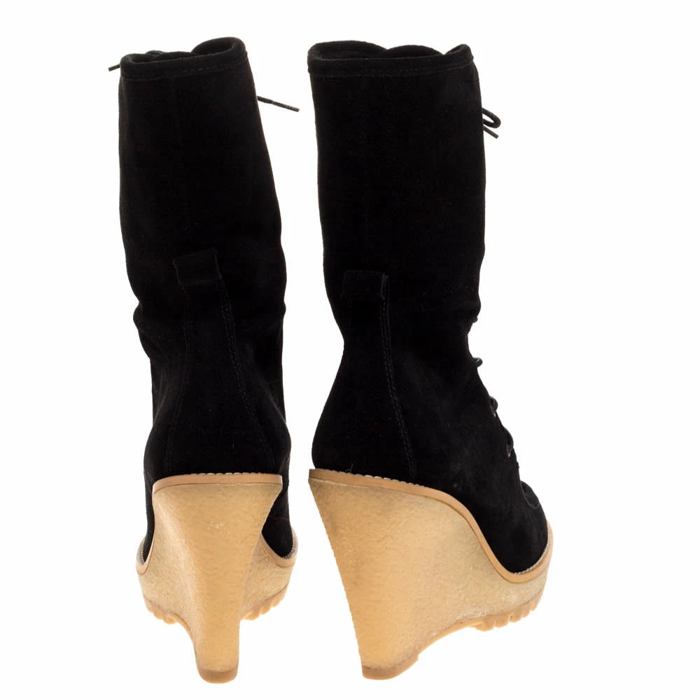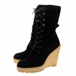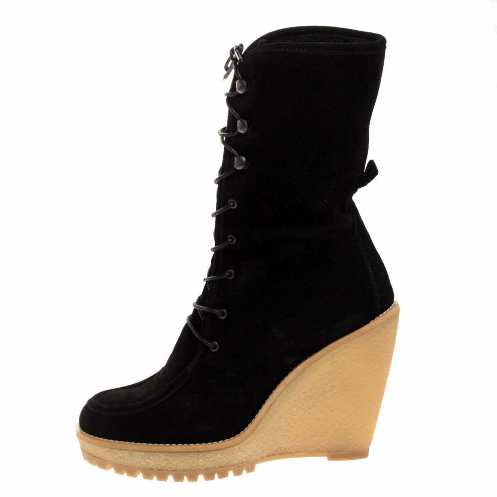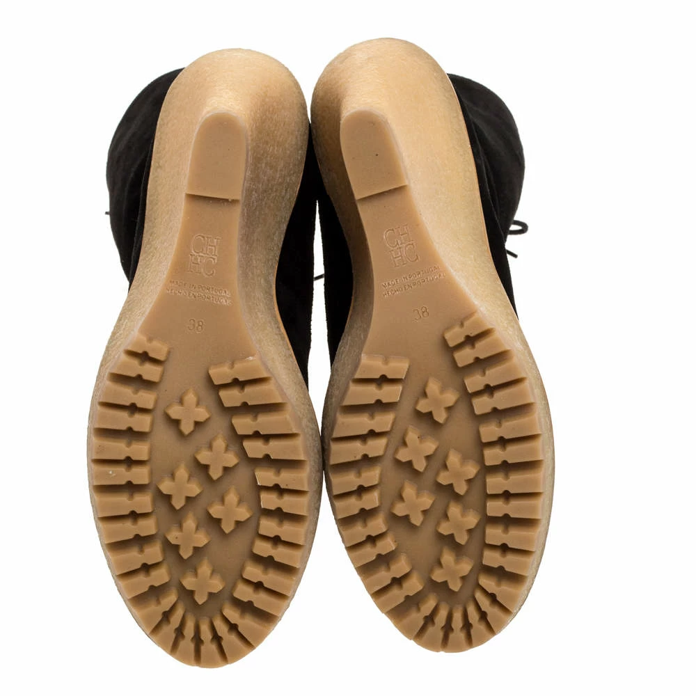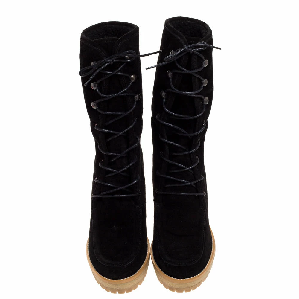 Flaunt your love for the latest trends with these boots from Carolina Herrera. Built to last and add sophistication to any outfit, these black-hued boots are all you need. They are crafted from quality suede in a mid-calf silhouette and are styled with round toes, lace-ups, gunmetal-tone hardware, and rubber platforms as well as wedges.