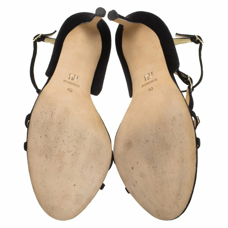 Black suede curved strappy sandals by Carolina Herrera are for those nights where you want to go that extra mile and look exquisite. This pair of strappy sandals features 3 buckles for that perfect adjusted feel that takes for long hours comfortably in this shoe. Also featuring a red insole with black toe cap, they are surely eye-catching, versatile, and unique, elegant and classy.