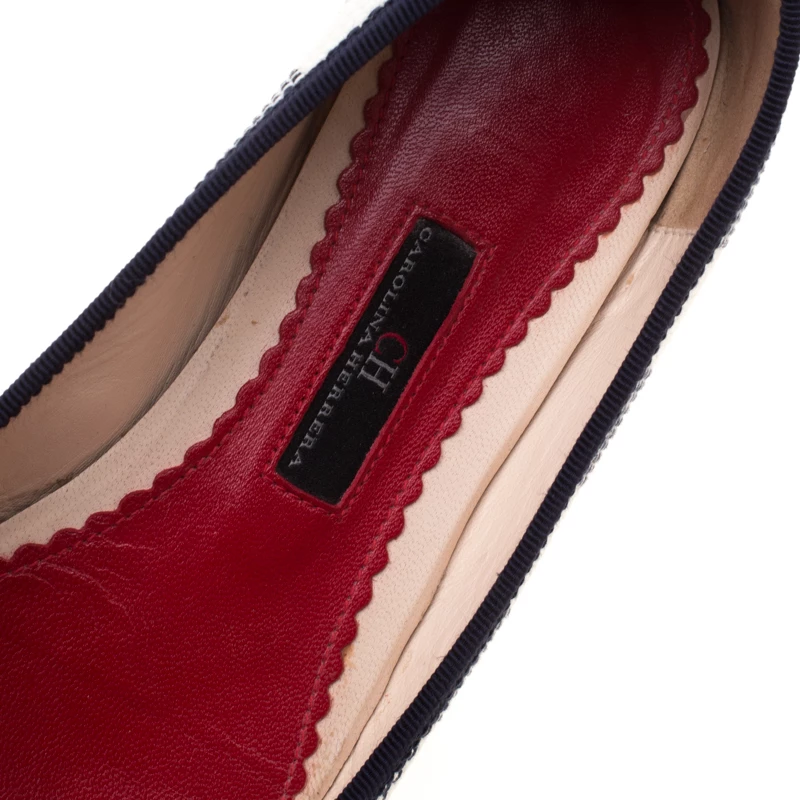 A common sight in the closets of fashionistas is a pair of ballet flats. They are perfect to wear on busy days and just stylish enough to assist one’s style. These Carolina Herrera flats are crafted from blue patent leather and canvas. They feature little bows and the CH logo on the cap toes.