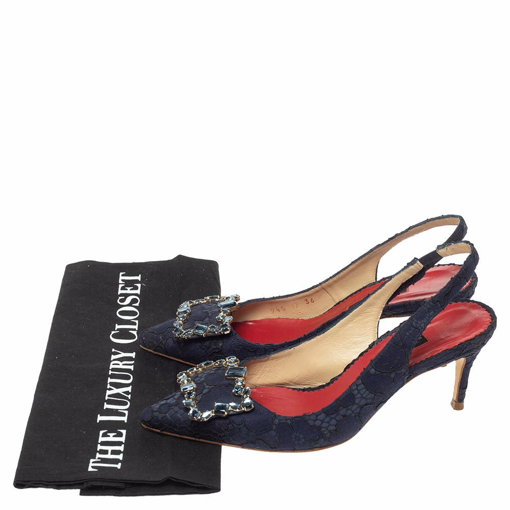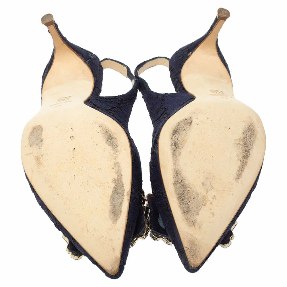 Treat your feet to this gorgeous pair of sandals from Carolina Herrera. Crafted from blue lace, this pair features an embellished bow accent over pointed toes, stiletto heels, and slingbacks. The insoles are lined with leather to offer maximum ease.