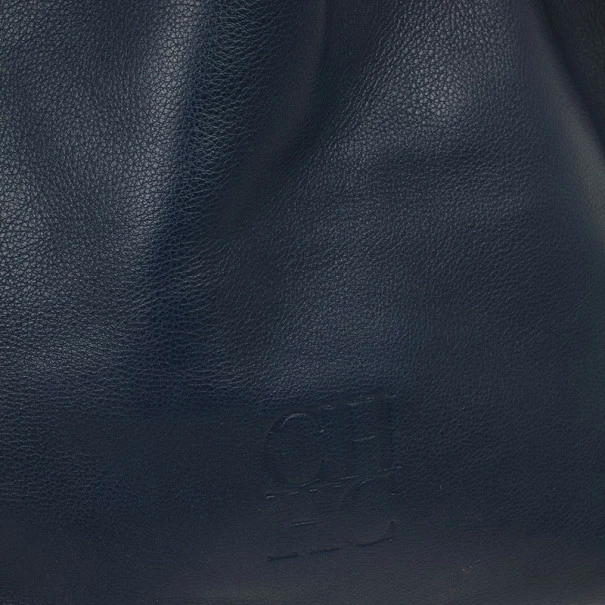 This Carolina Herrera Blue Leather Tote is made from versatile blue leather with double flat leather handles. It is equipped with a slide tab closure. The exterior is discretely engraved with CHHC initials.Original Retail Price: US $470