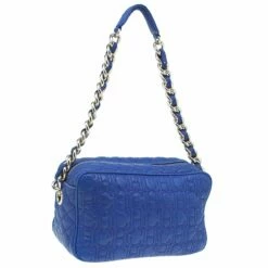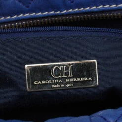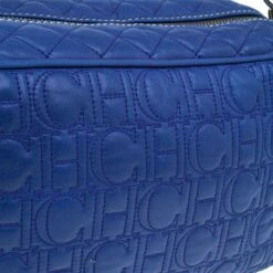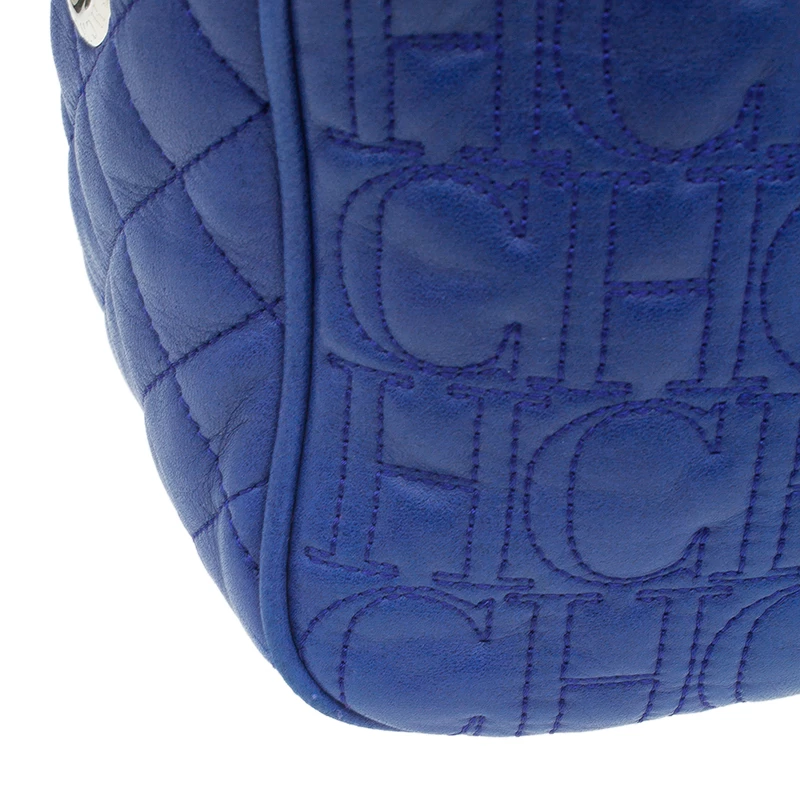 Sling this classy quilted Carolina Herrera bag over your shoulder for a night out or during the day. Made from quilted leather and it comes with stitched CH monogram all over, in a rich blue color. With eyelets, this bag is equipped with chain and leather woven shoulder strap with a leather rest and a top zip closure. The interior is lined with black fabric and houses a single zipped pocket and a brand plaque.