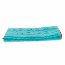 This exquisite wallet by Carolina Herrera comes elegantly crafted in blue monogrammed leather. It features a zip around closure with gold-tone details. The fabric and leather-lined interior exhibits card slots and a zipper pocket.