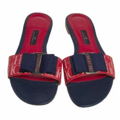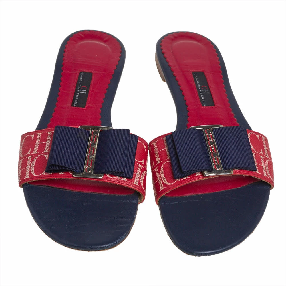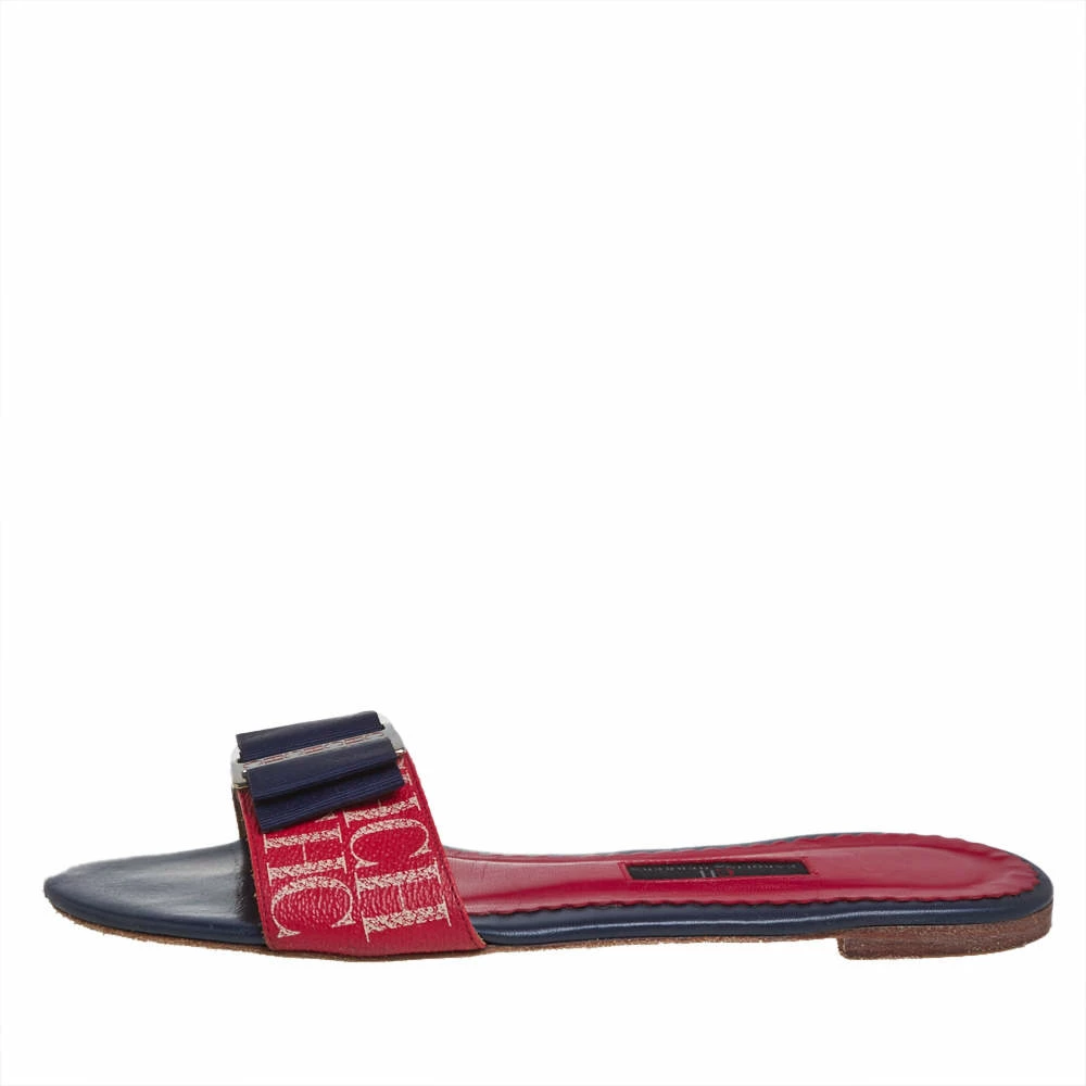 Comfort and style come together with these flat slides from Carolina Herrera! These blue and red slides are crafted from leather and feature an open-toe silhouette. They flaunt pleated bow details on the vamp straps and come equipped with comfortable insoles. They are a gift your feet absolutely deserve!