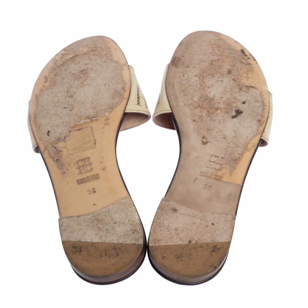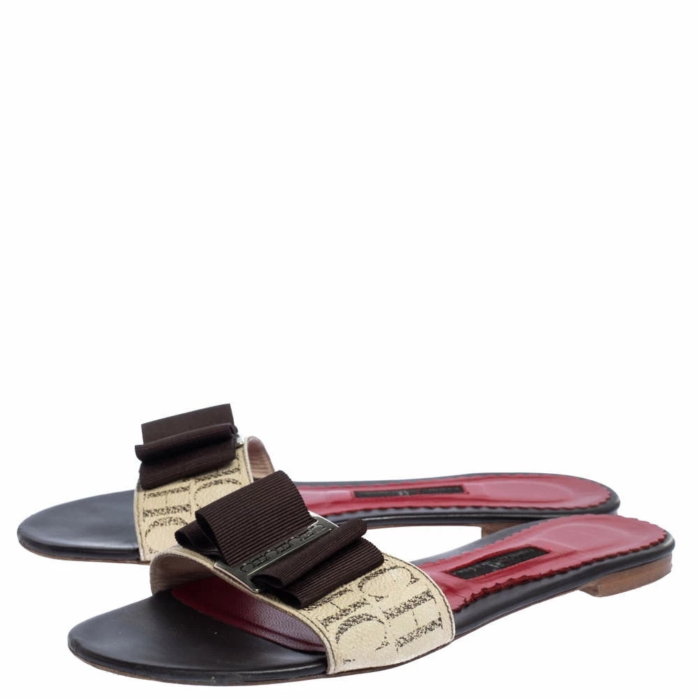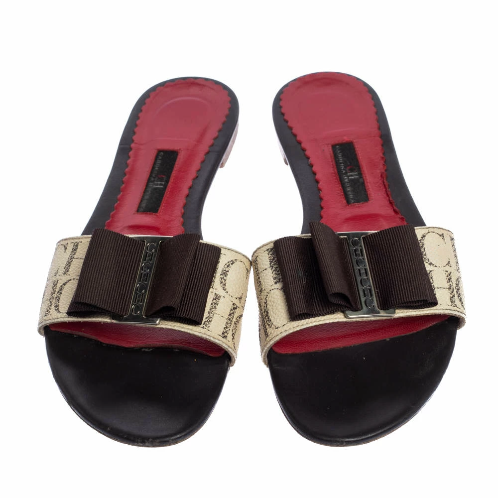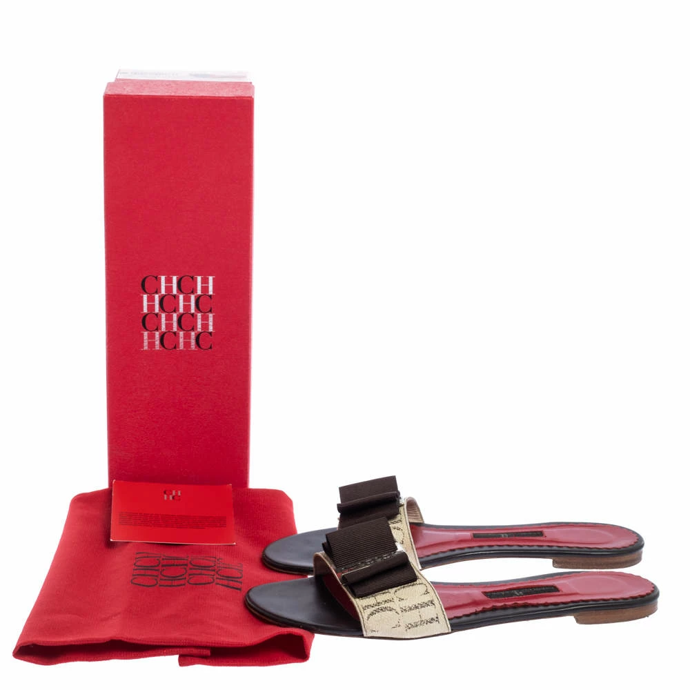 These classic flats by Carolina Herrera are a closet staple for any woman. Chic and classic, these slides have been crafted from CH logo coated canvas. They have open toes, bow detailing, gold-tone hardware, and leather soles.