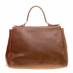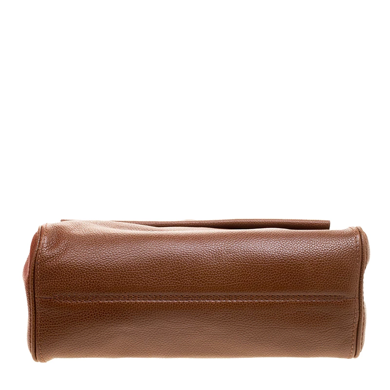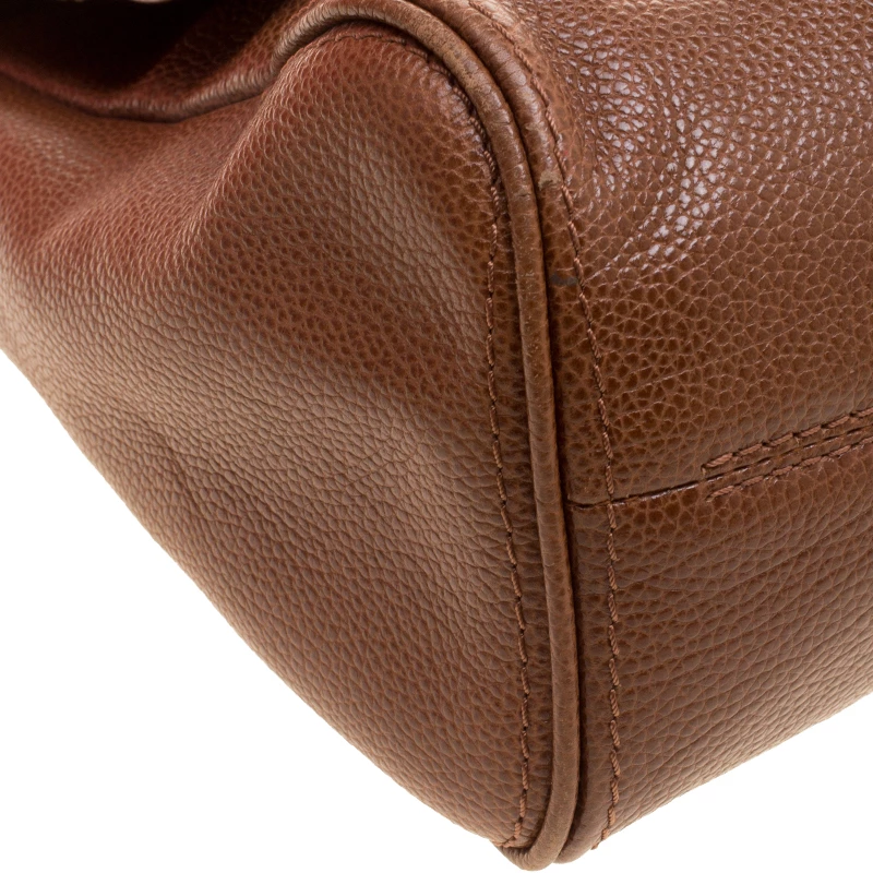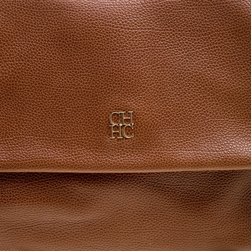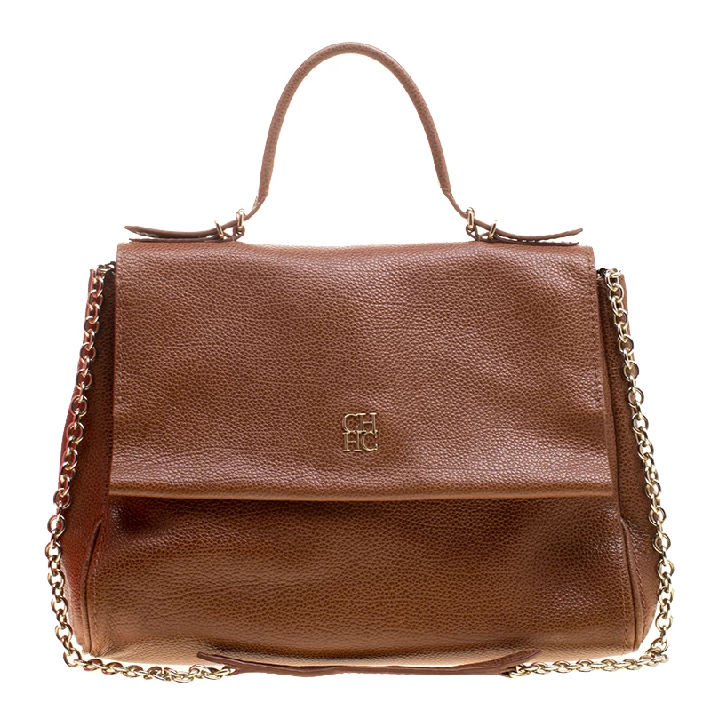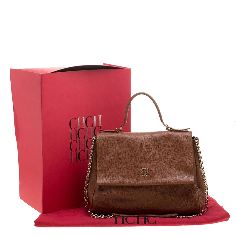 This practical and stylish bag from the luxury brand CH Carolina Herrera is crafted in brown pebbled leather. It features a front flap detailed with the brand logo in gold-tone hardware. The bag comes equipped with a single handle and a chain link shoulder strap. It has a spacious interior lined with suede.