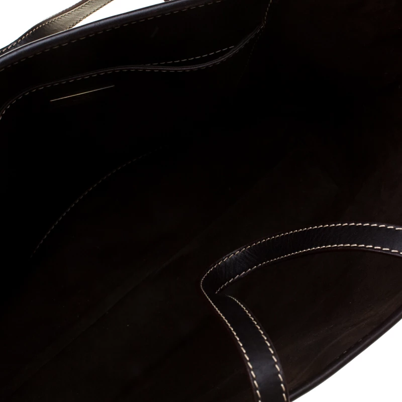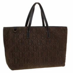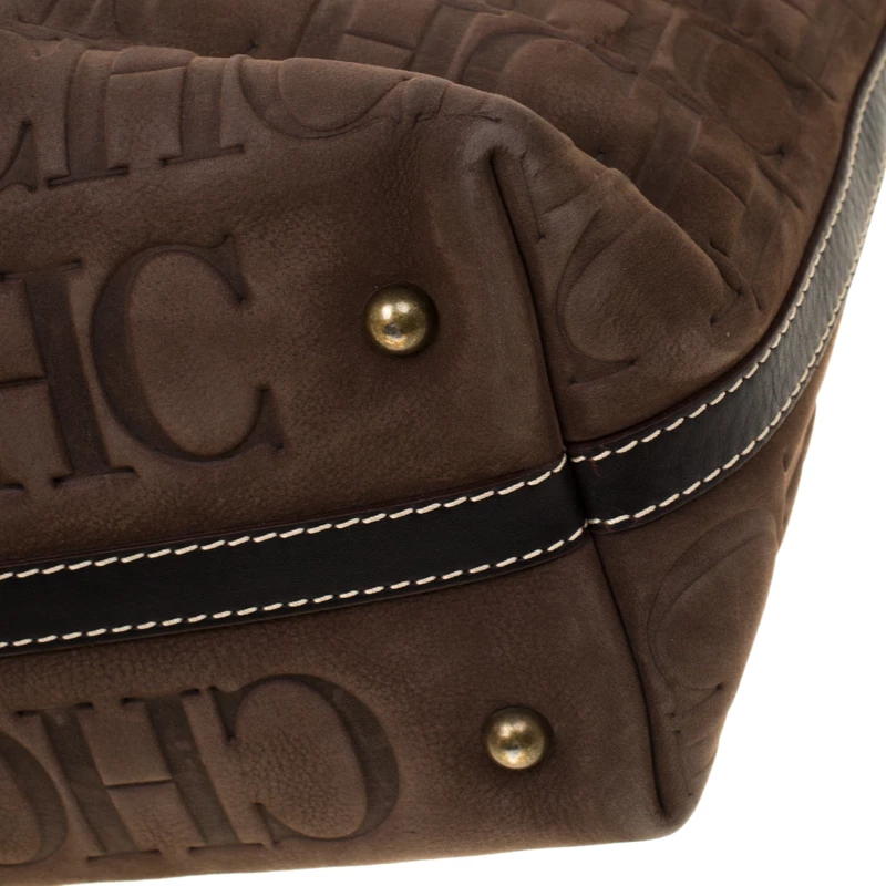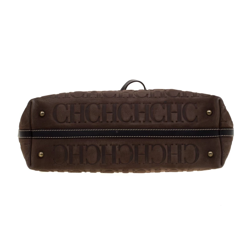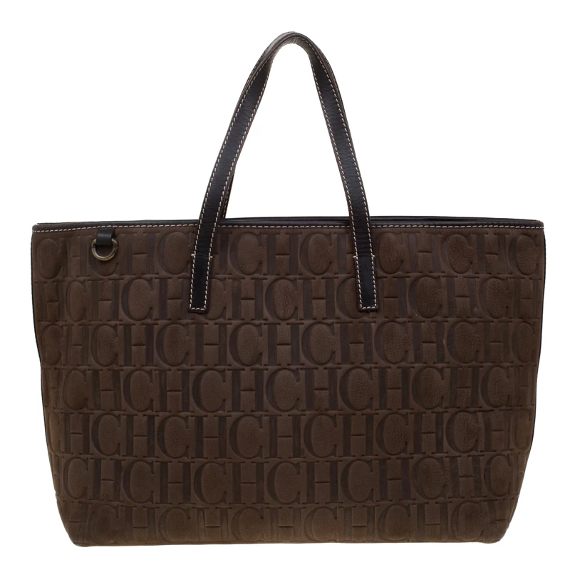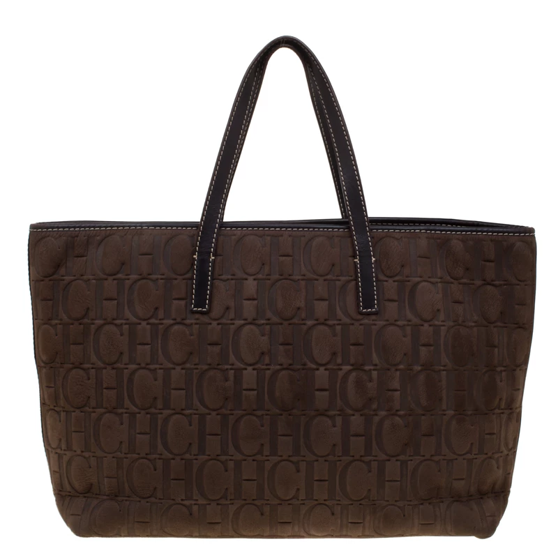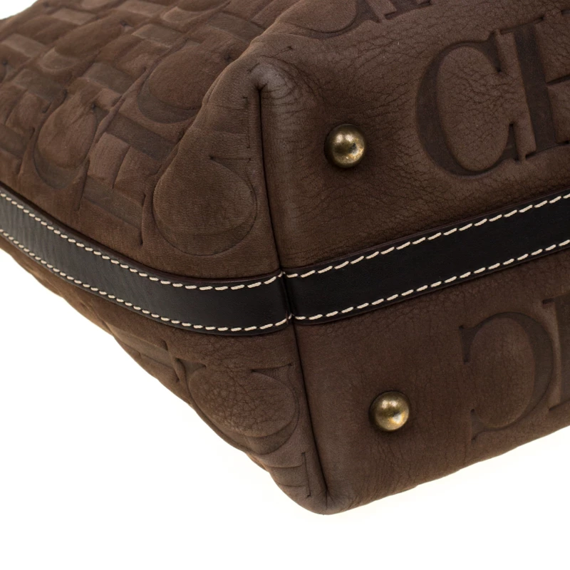 Carolina Herrera brings you this tote that is a perfect balance of elegance and practical utility. It is crafted from Monogram embossed nubuck and leather in a brown hue. It has a well-sized Alcantara interior and the bag is completed with two top handles and protective metal feet.