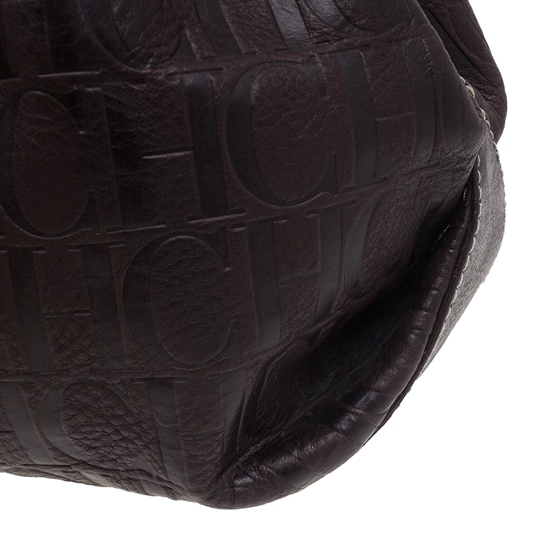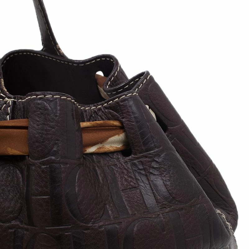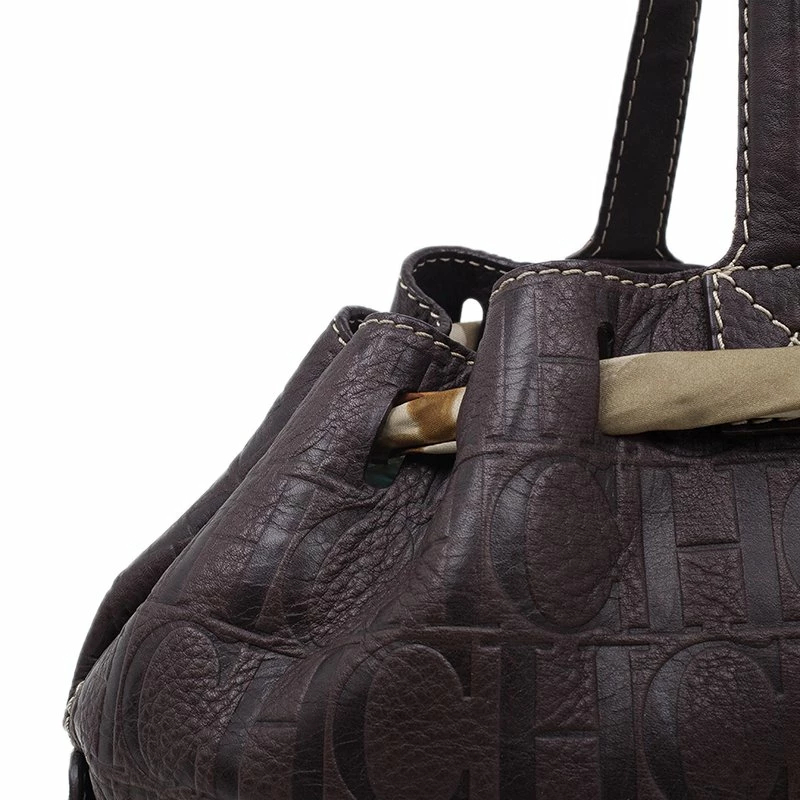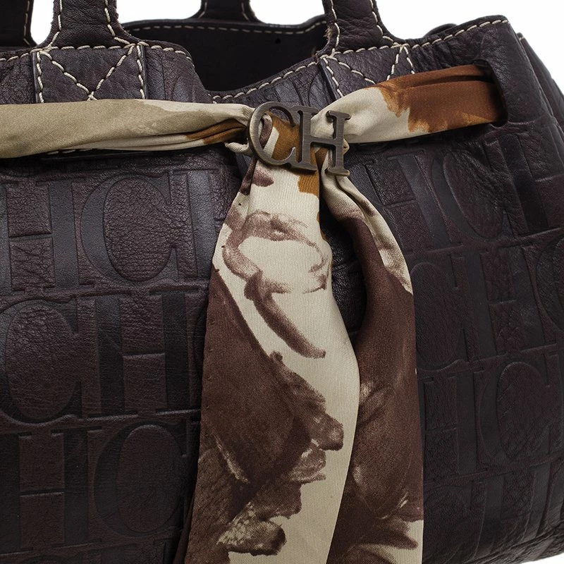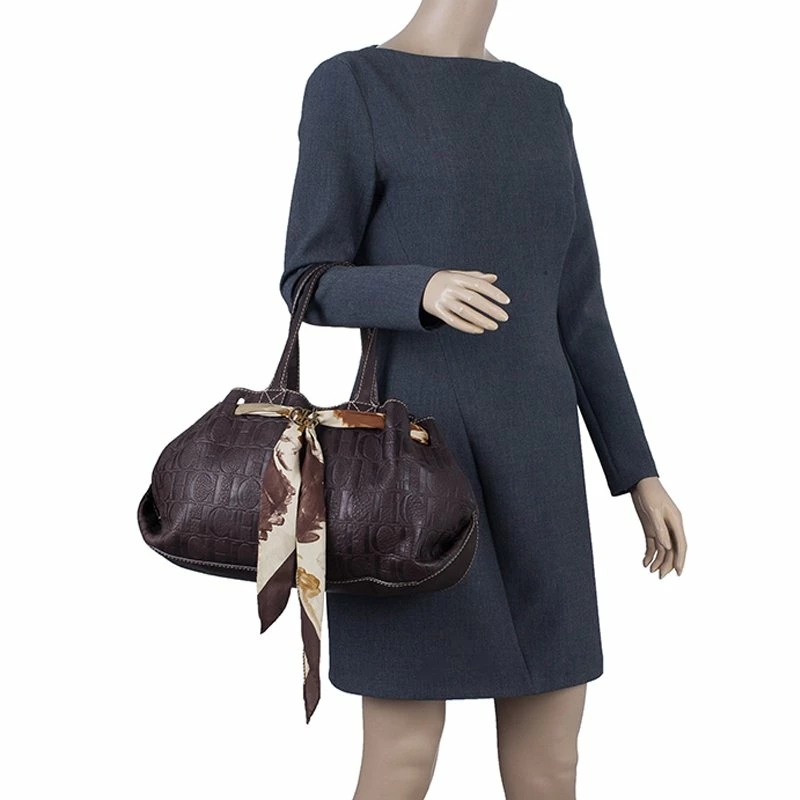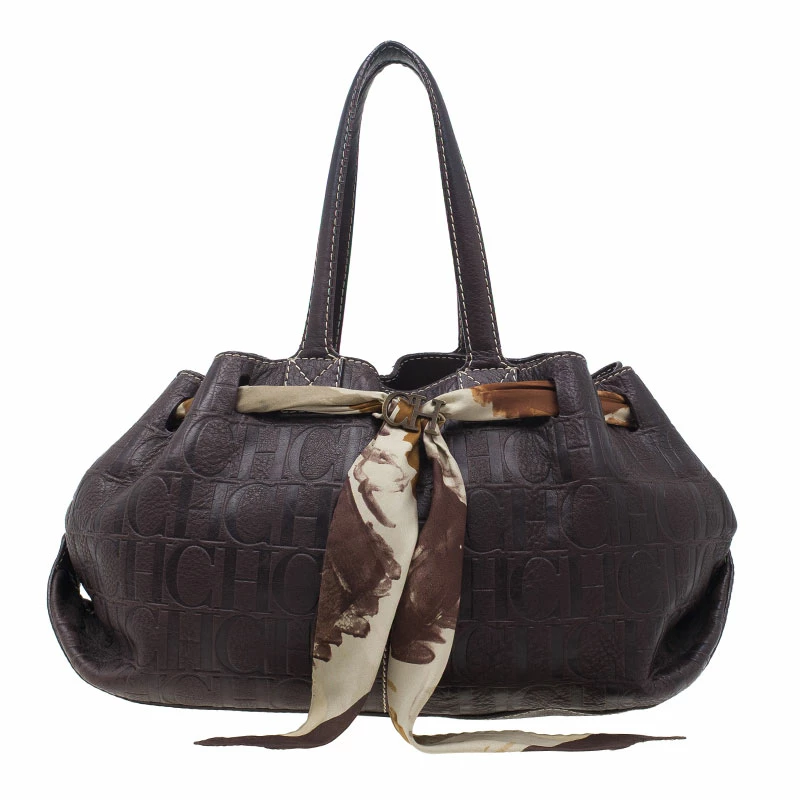 Sling this classy Carolina Herrera bag over your shoulder for a casual day out or a special occasion. Made from brown leather, it comes with an embossed CH monogram exterior and pleated sides creating a stylish design. This bag is equipped with top handles and a drawstring closure with a fashionable printed scarf that is ornamented with a CH gold-tone metal buckle. The interior is lined with fabric and houses a single zipped pocket.