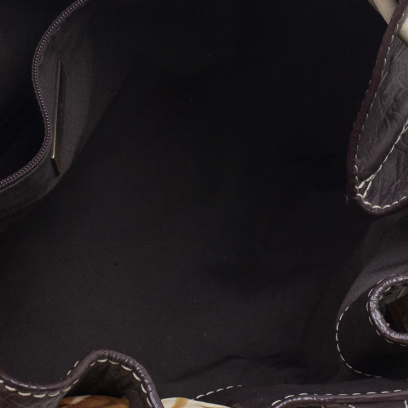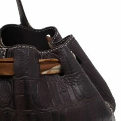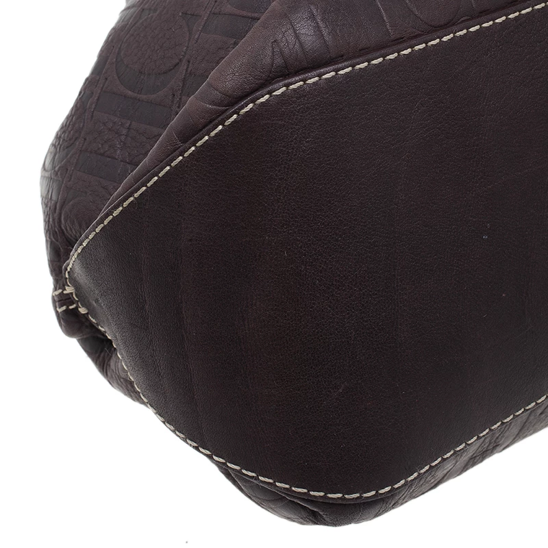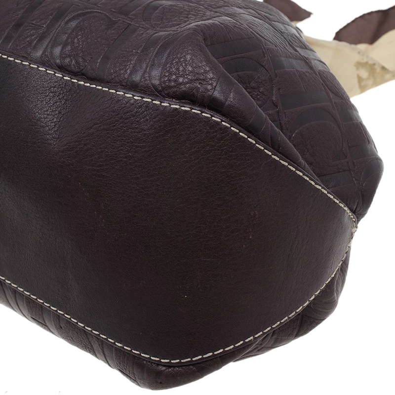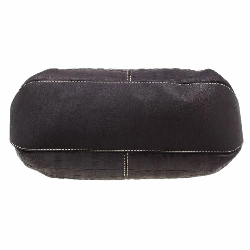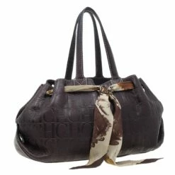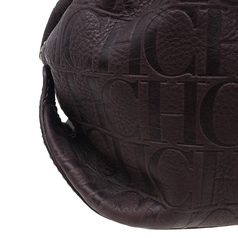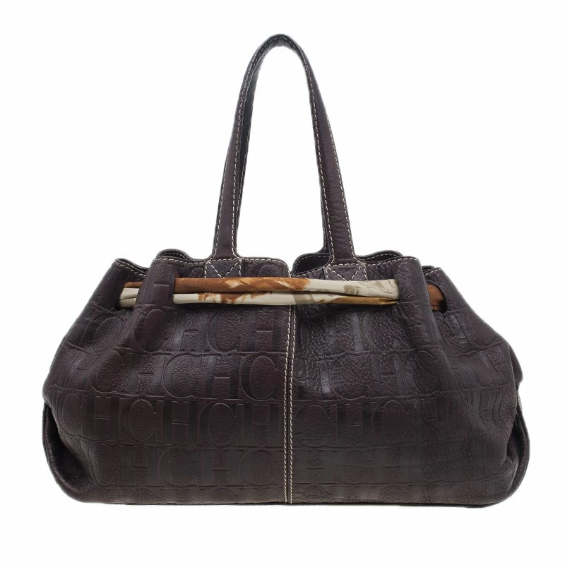 Sling this classy Carolina Herrera bag over your shoulder for a casual day out or a special occasion. Made from brown leather, it comes with an embossed CH monogram exterior and pleated sides creating a stylish design. This bag is equipped with top handles and a drawstring closure with a fashionable printed scarf that is ornamented with a CH gold-tone metal buckle. The interior is lined with fabric and houses a single zipped pocket.