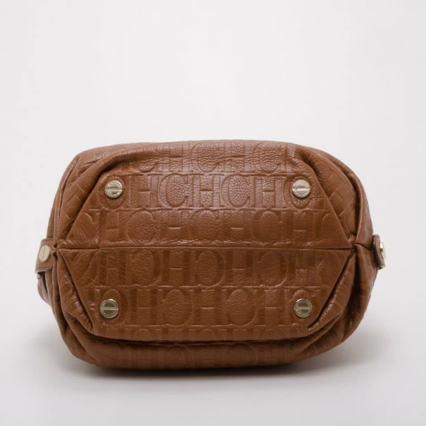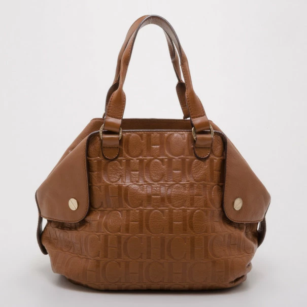 This modern yet practical Carolina Herrera brown monogram folded flap tote is a must-have. Made from monogram CH tan leather, the exterior is detailed with folded leather corners with large studs and two leather double handles. The interior is lined with black canvas and features a zip pocket with a CH silver plate. Condition: Gently Used (Two pen marks on one flap, otherwise largely clean exterior and interior)Dimensions: 43 CM(L) 29 CM(H) 20 CM(W) Handle Drop: 16 CM (Distance between handle and top of the bag)Material: Leather Exterior, Canvas InteriorHardware: Sliver-toneIncludes: Original Dustbag