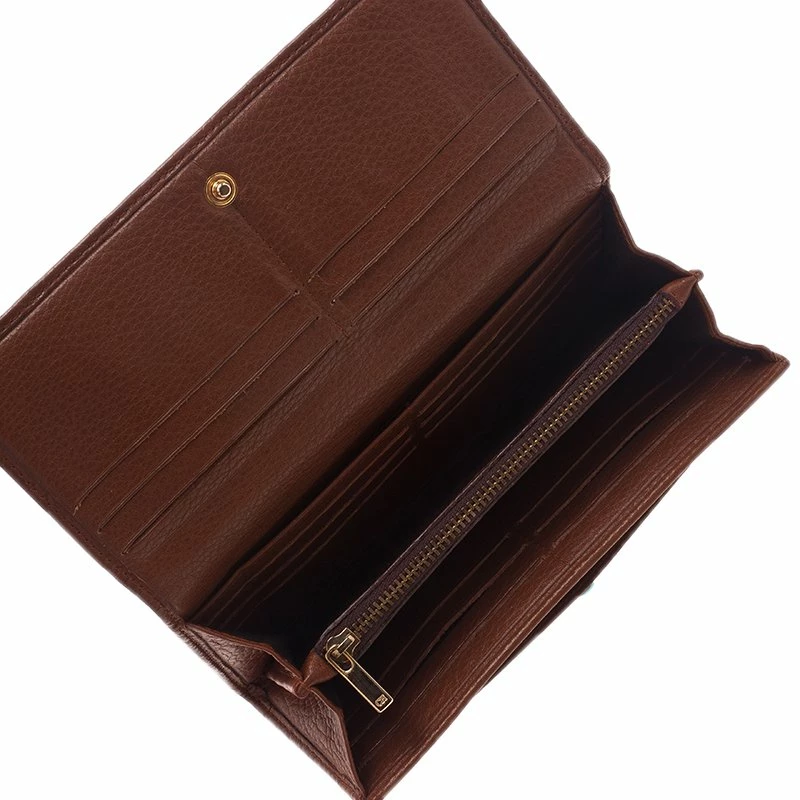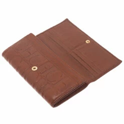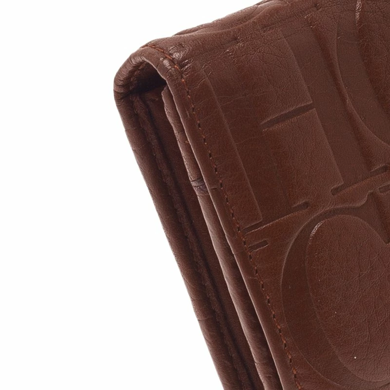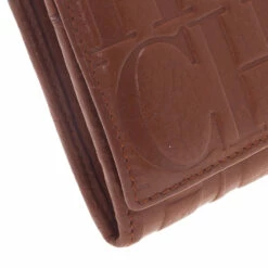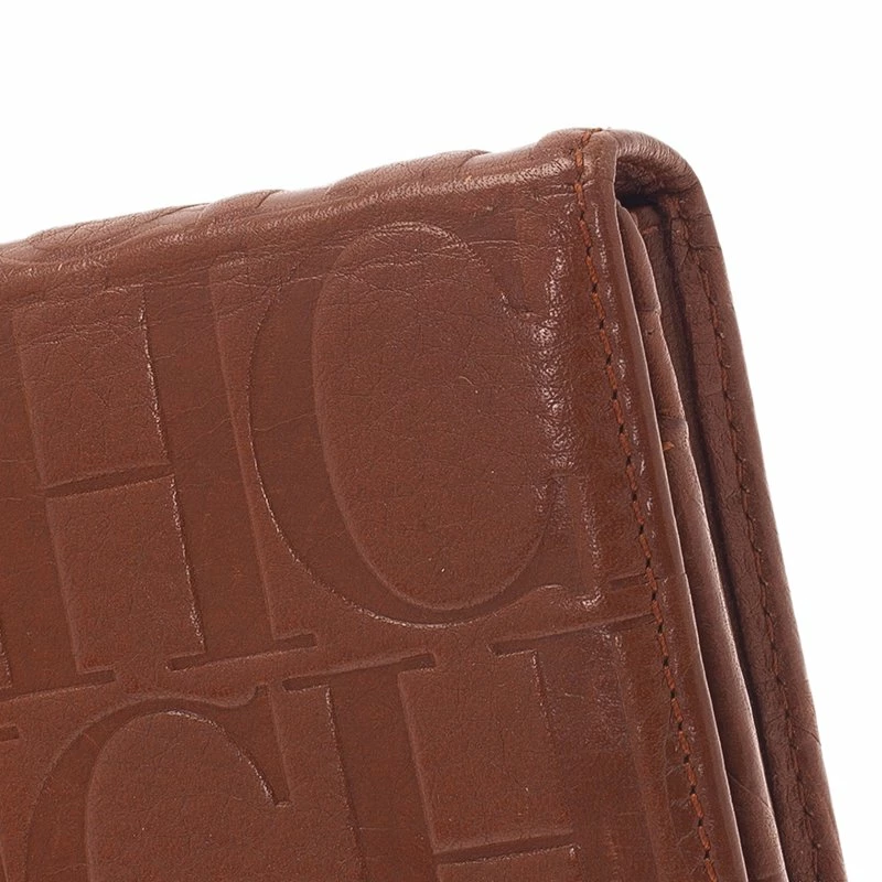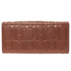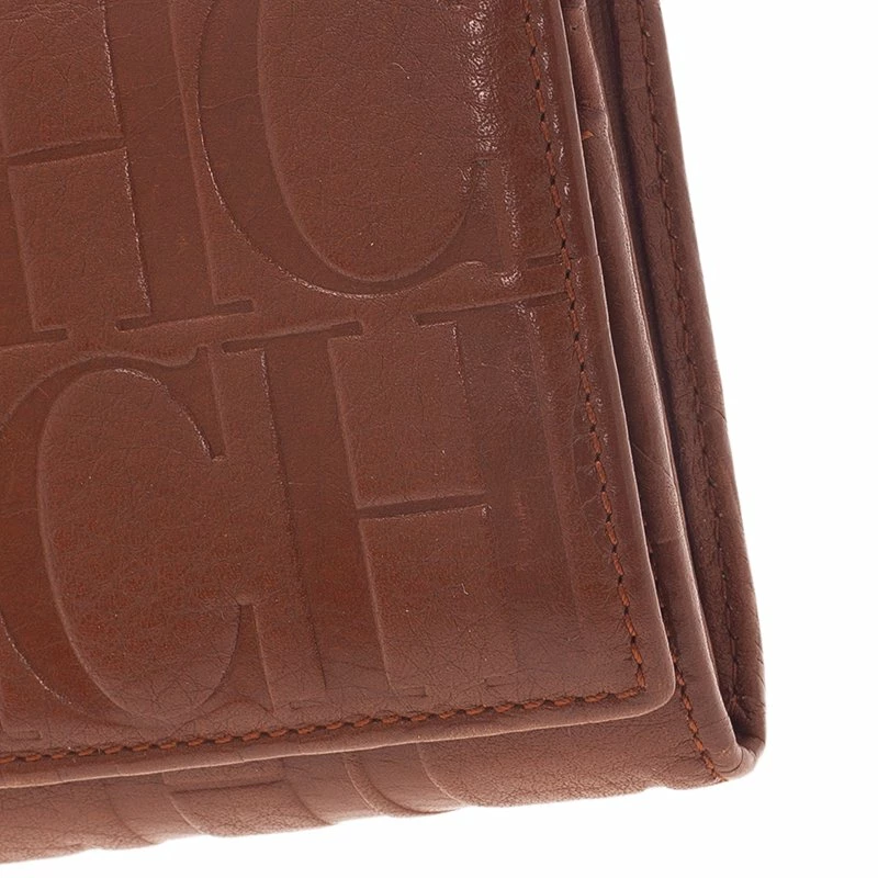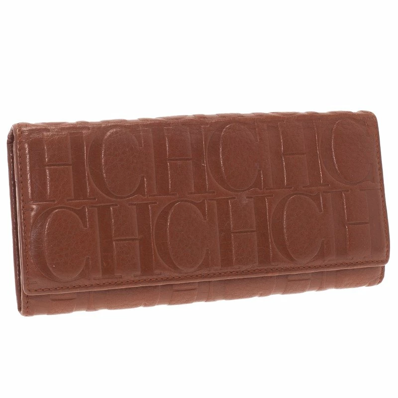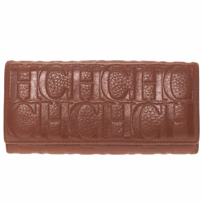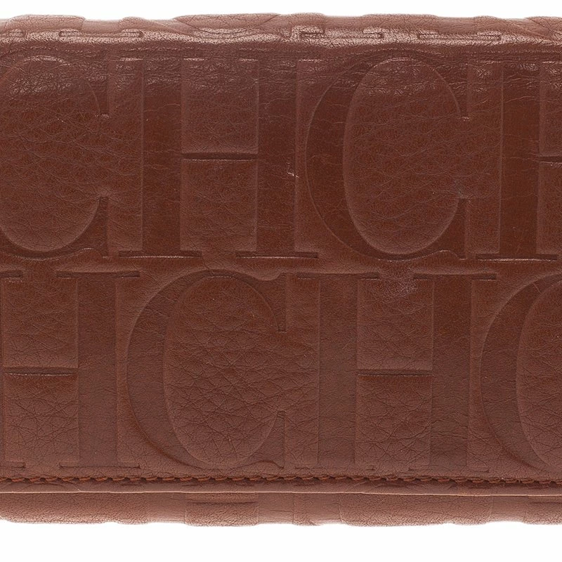 This sleek and practical Continental Wallet by Carolina Herrera. Crafted from CH monogram embossed brown leather, it features an easy to open flap front closure. The interior is lined with leather and features eighteen credit card slots, two patch pockets and a zip pocket. Be in style and organized with this wallet!