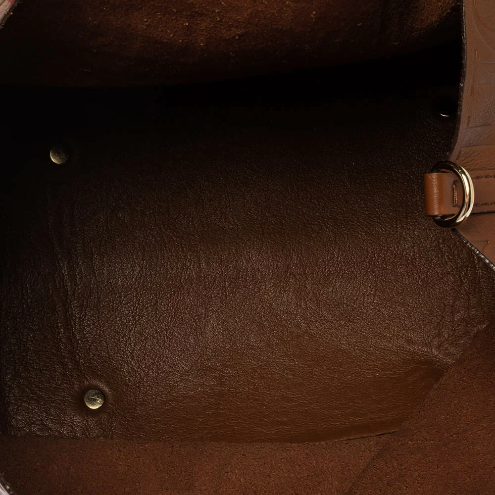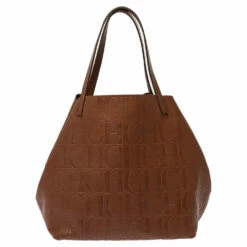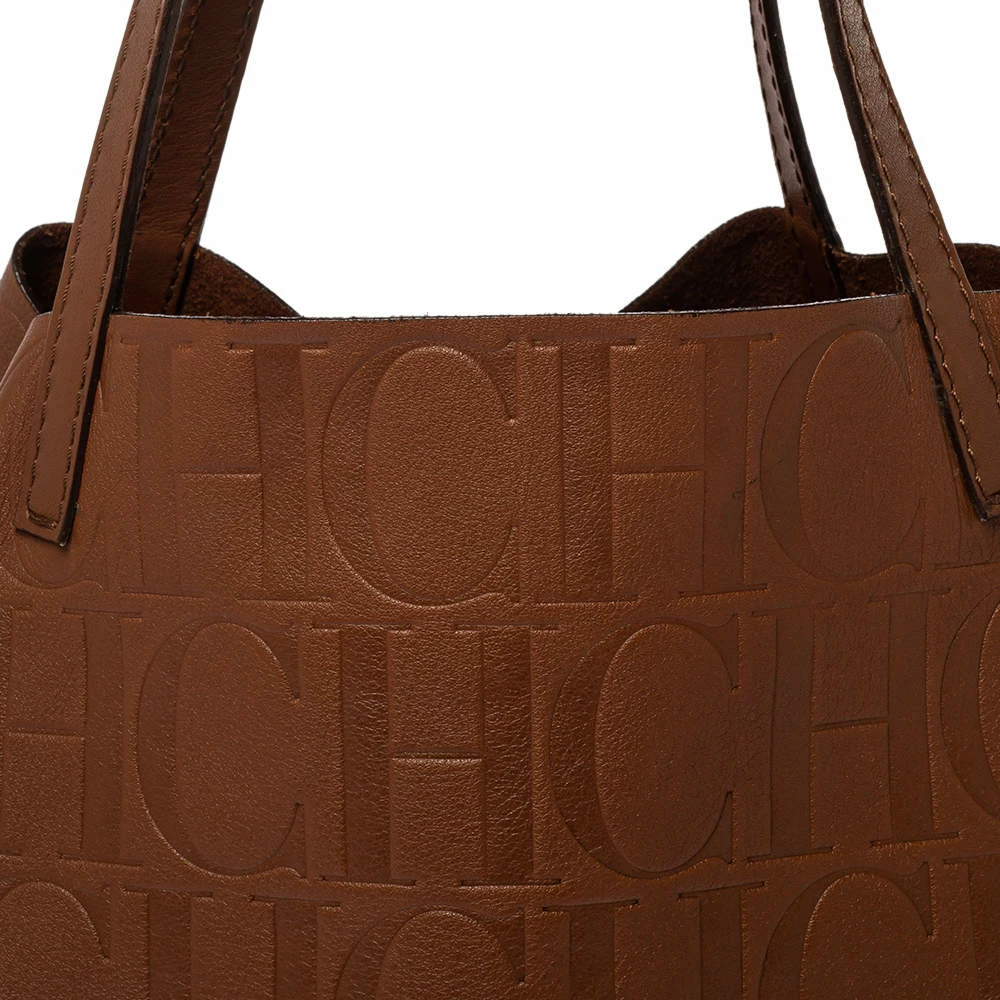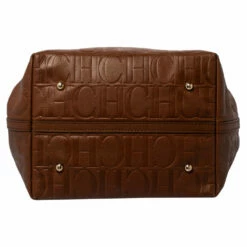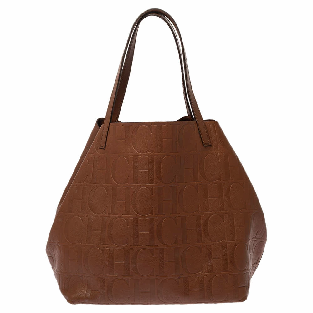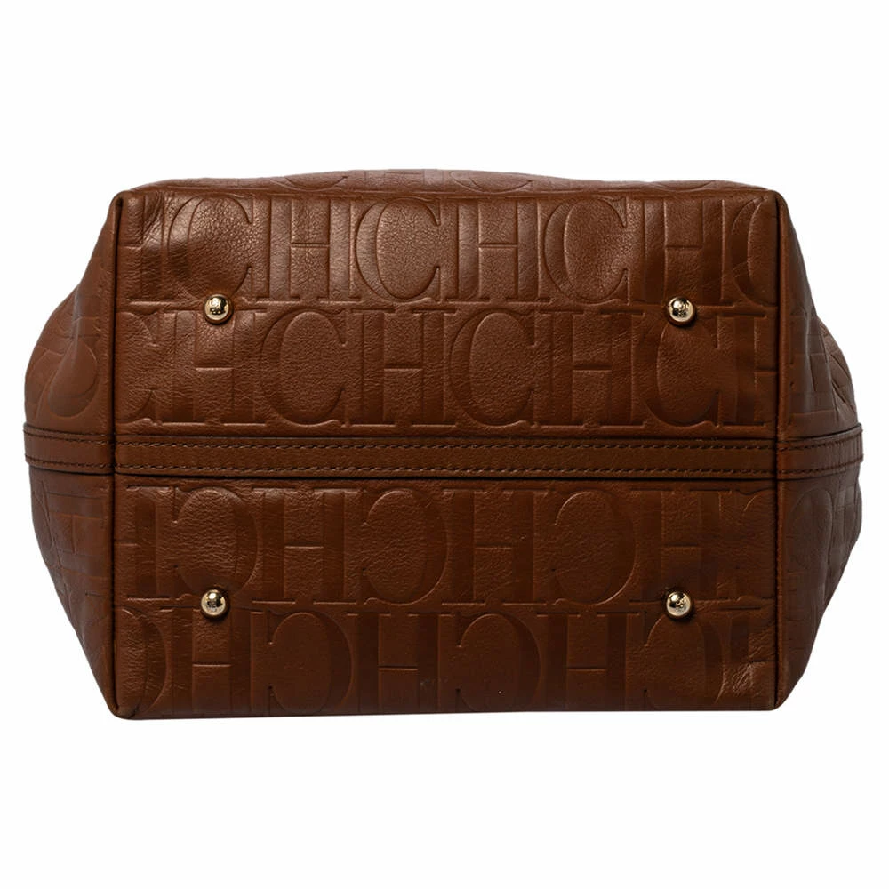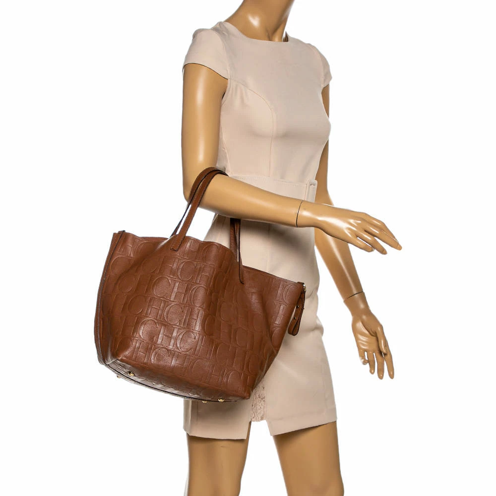 This Carolina Herrera tote is from the Matryoshka collection. This bag is made from brown monogram leather. It is equipped with two flat handles, and the base has four protective feet. The spacious bag can be carried easily on the handles and shown off to the world.