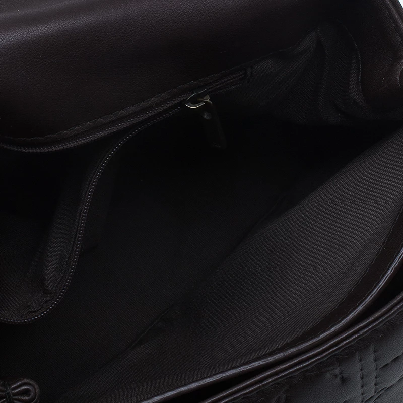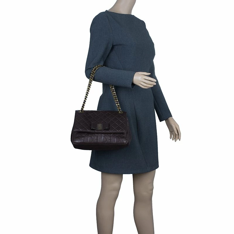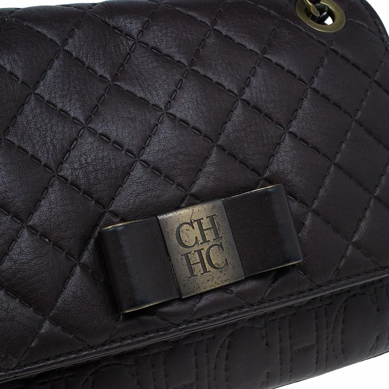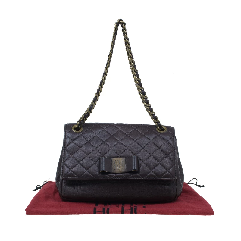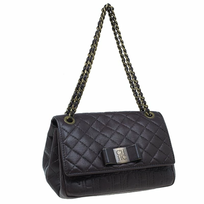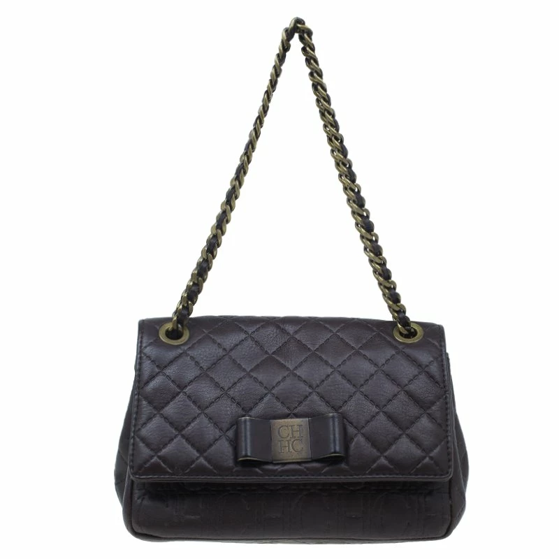 This version of the Carolina Herrera bag is crafted from soft quilted leather embossed with the diamond stitching pattern and CH monogram at the front. It is accented with chain link and leather shoulder straps, a front flap with a snap closure , a metal brand engraved bow detailing at the front and gold-tone hardware. The spacious interior is lined with fabric and features two compartments and a zip pocket.