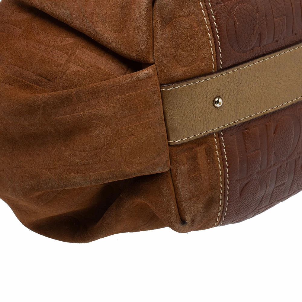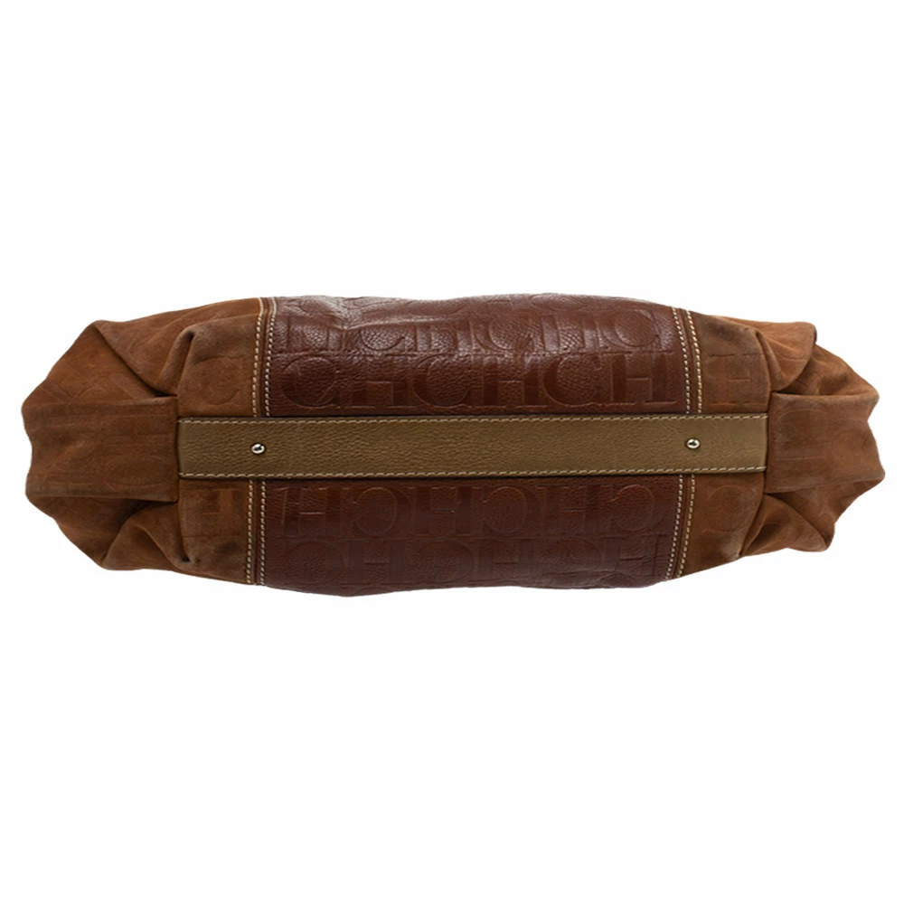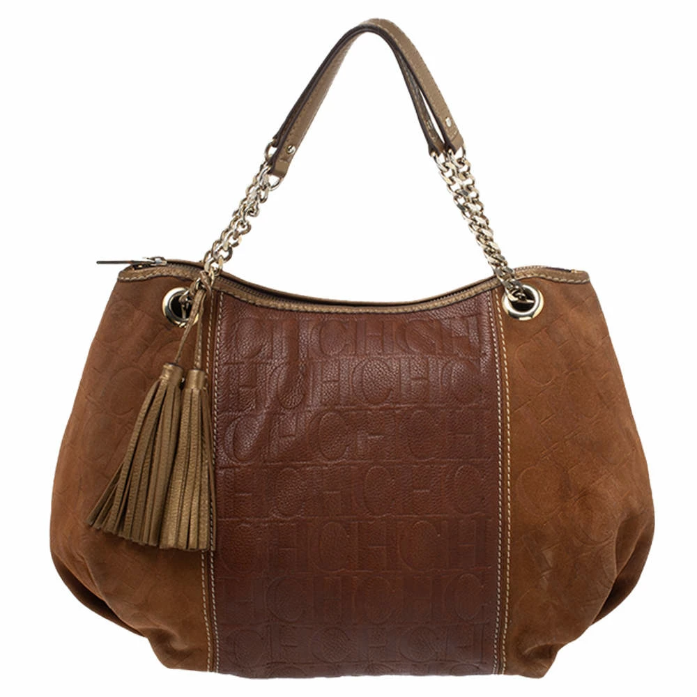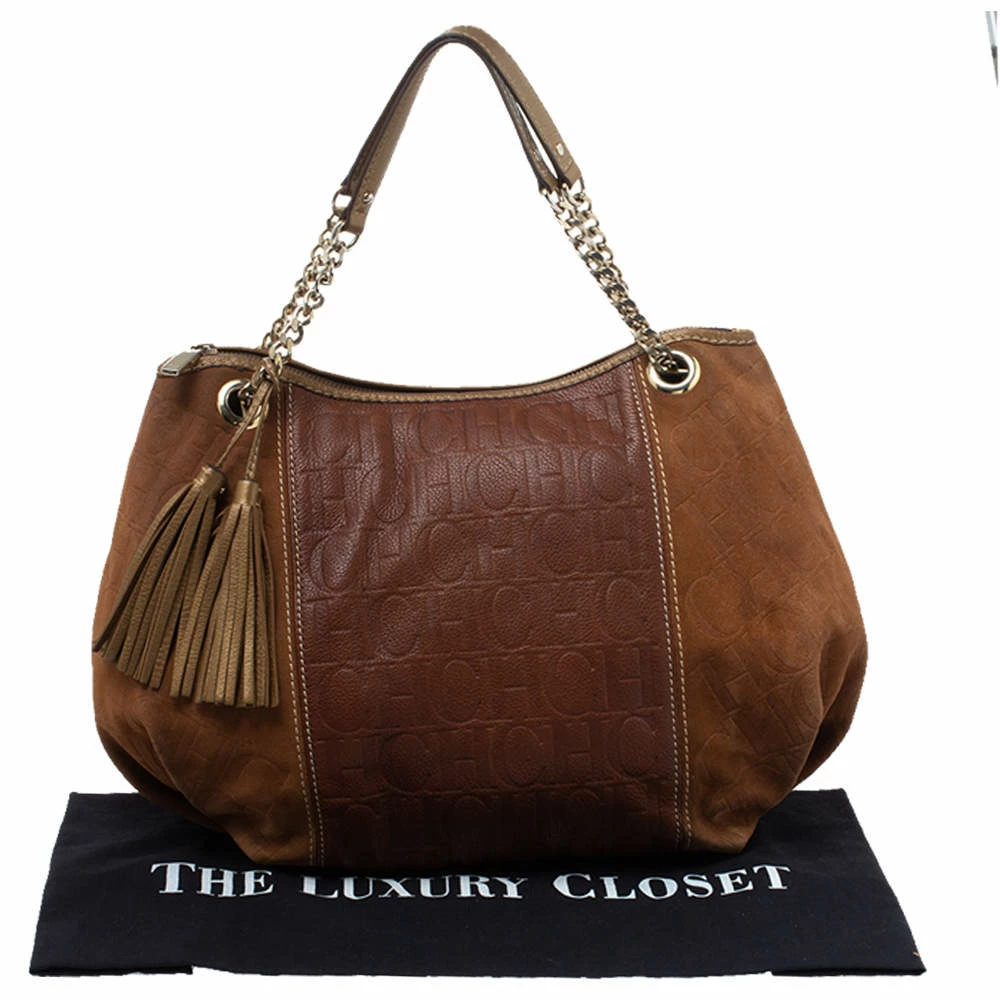 Carry this Carolina Herrera hobo and step out like a modern-day fashionista. This brown monogram suede and leather creation is designed to complement your stylish personality. It flaunts two tassel charms on the front, dual chain woven handles, and a top zip closure that opens to a spacious nylon-lined interior.