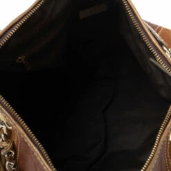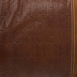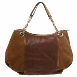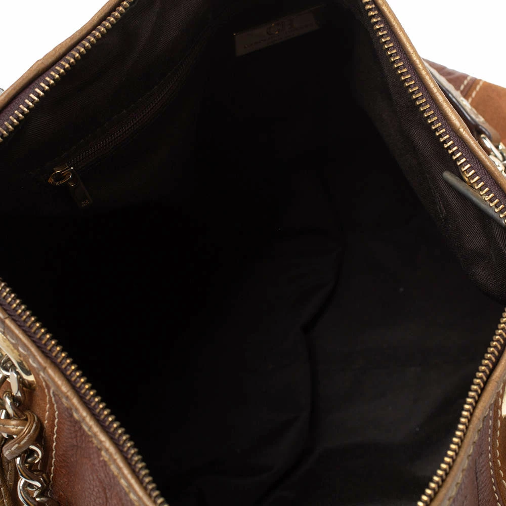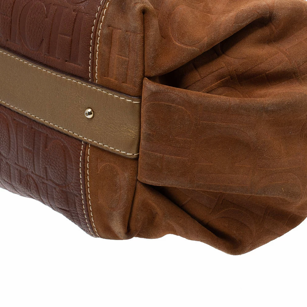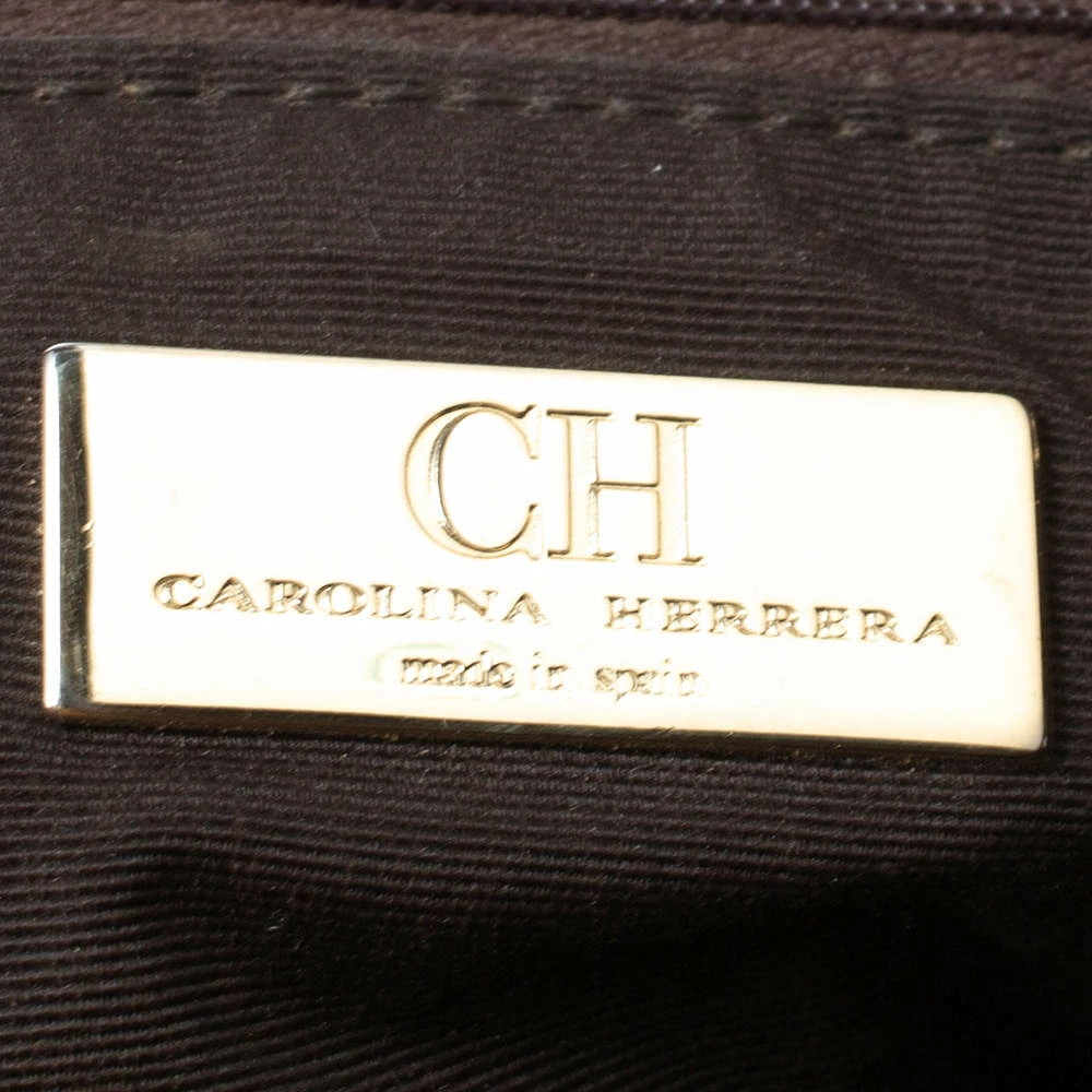 Carry this Carolina Herrera hobo and step out like a modern-day fashionista. This brown monogram suede and leather creation is designed to complement your stylish personality. It flaunts two tassel charms on the front, dual chain woven handles, and a top zip closure that opens to a spacious nylon-lined interior.