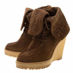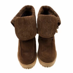 Carolina Herrera proves their high style and unique fashion taste with these edgy yet chic ankle boots. They are brimming with exquisite details like the smooth brown suede exterior with a logo-embossed foldover top, sturdy wedges, and the rubber soles. Grab this pair today and let it help you express your fabulous style.