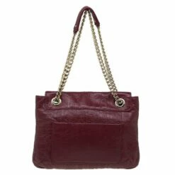 Audrey’ shoulder bag from the house of Carolina Herrera features a beautiful burgundy monogram leather with a flap style and decorated with an oversized bow detailing. It comes with a golden chain shoulder strap with a leather section. This bag opens to a fabric lined interior ideally sized to hold your essentials.