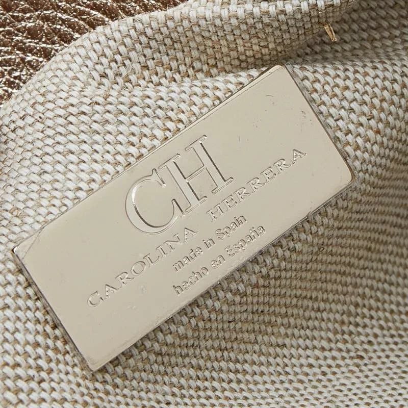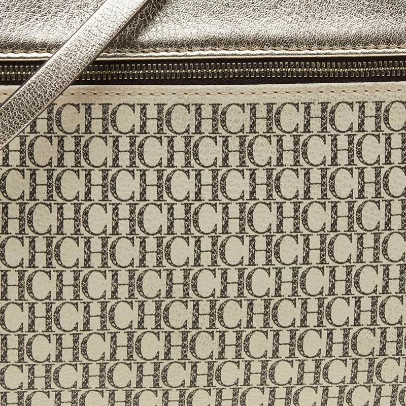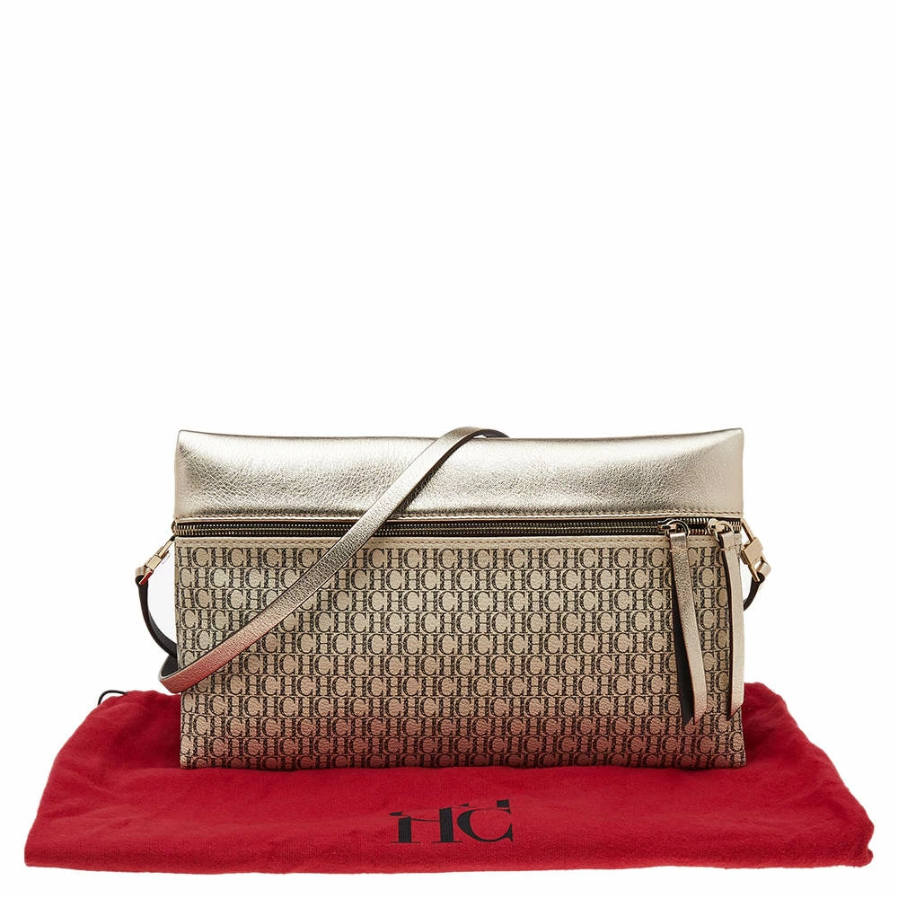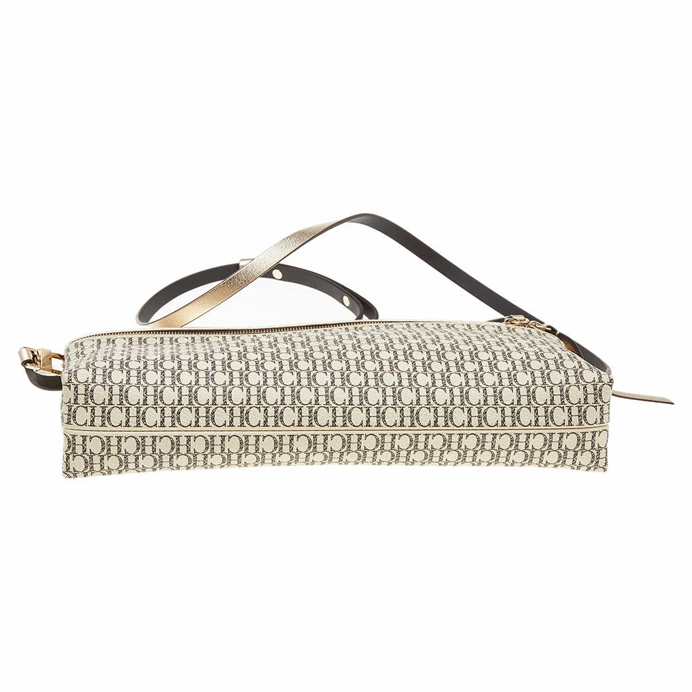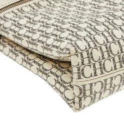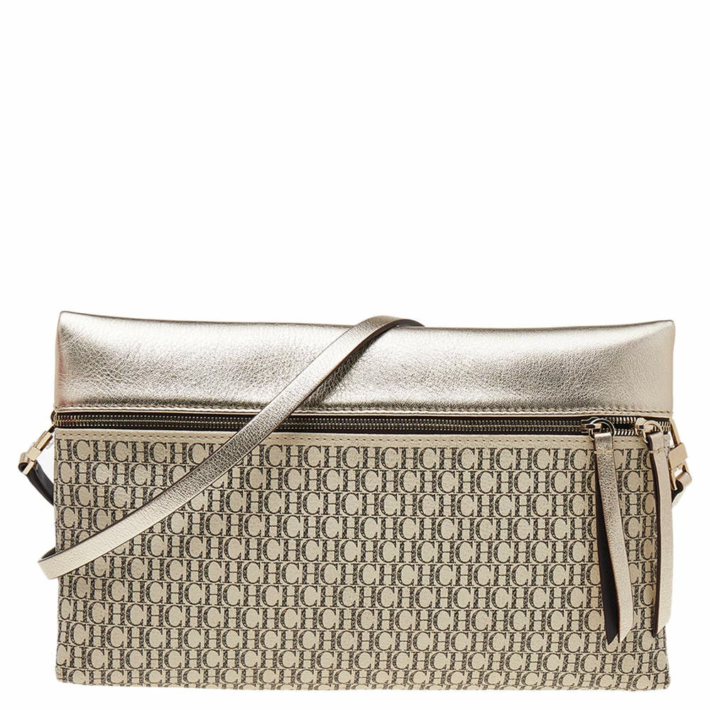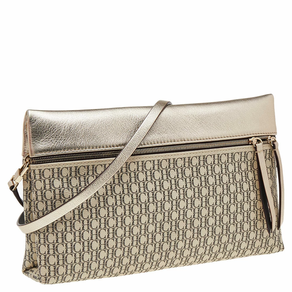 Showcasing a signature design, this clutch by Carolina Herrera will make for a convenient accessory. The signature coated canvas exterior is the highlight of this creation. The well-sized clutch has gold-tone hardware and a canvas interior secured by zippers.