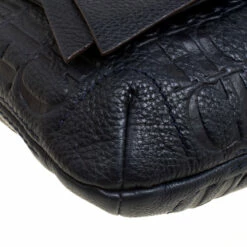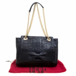 This Audrey bag from Carolina Herrera is styled with a bow detail on the front. It is crafted with signature monogram leather in dark blue colour and an open top that leads to a nylon-lined interior with a side zip pocket. The bag also features dual chain link straps with leather shoulder rest.