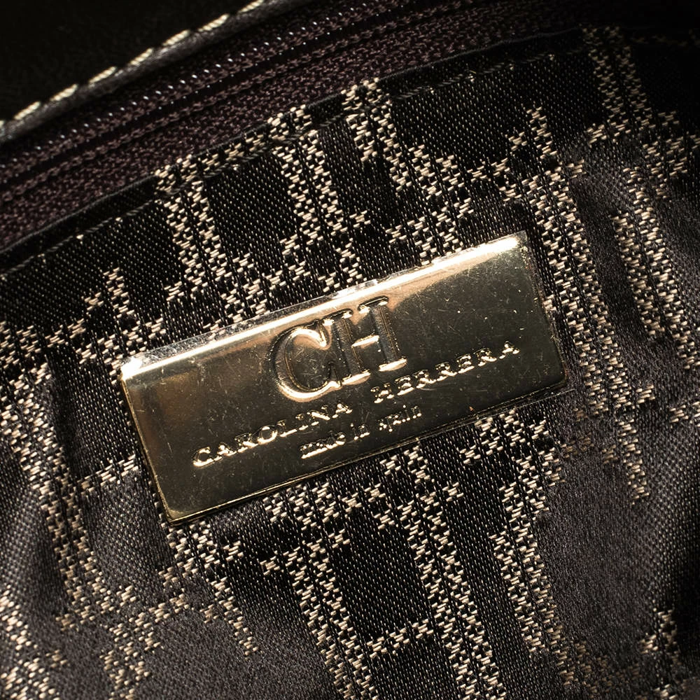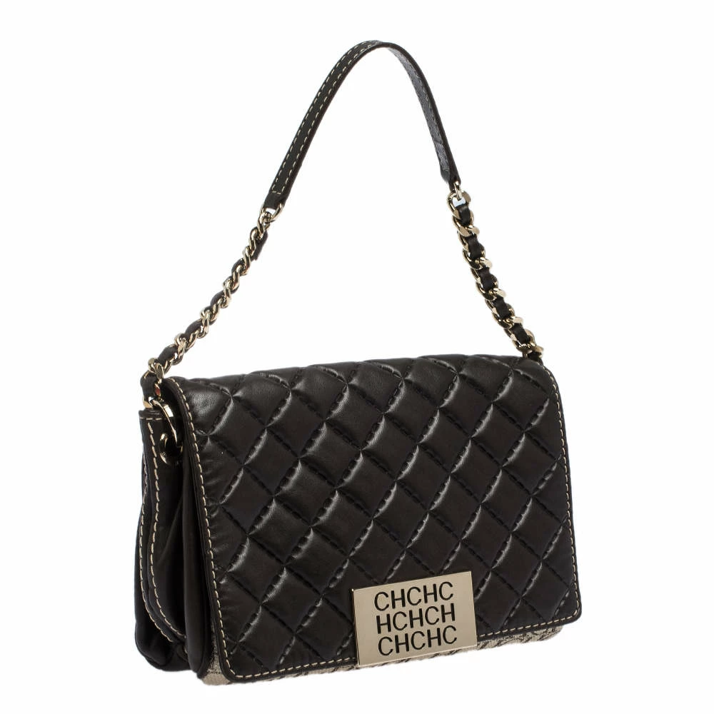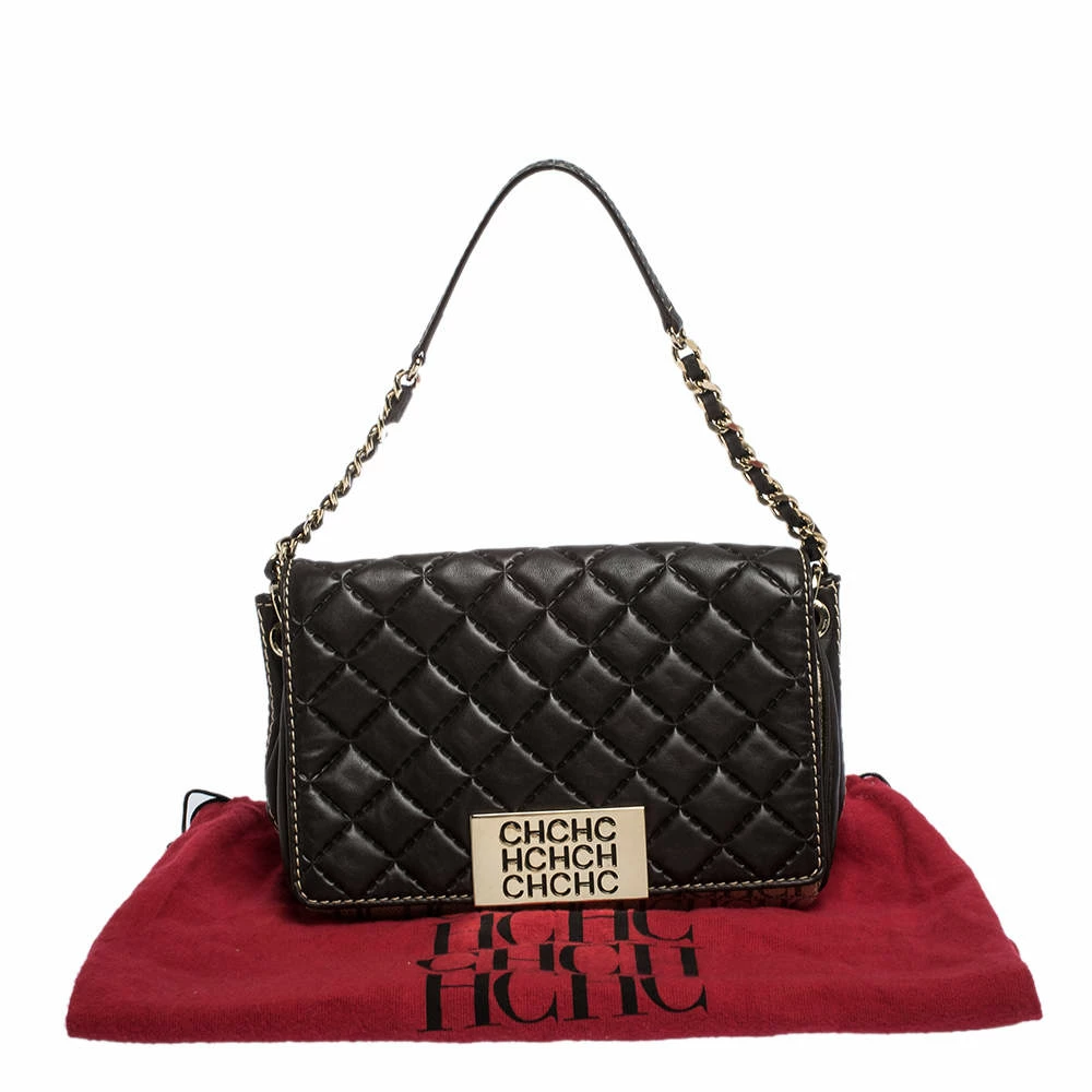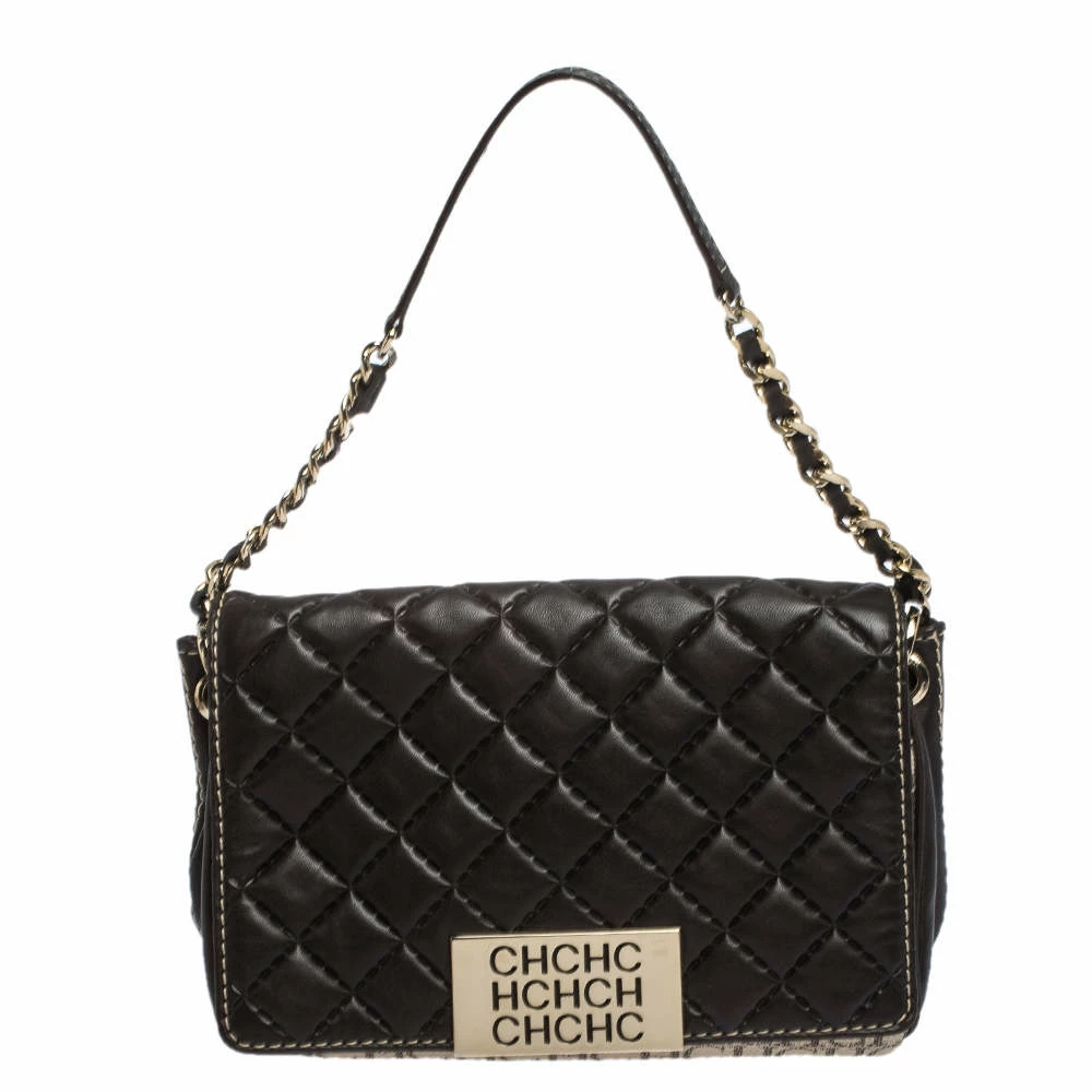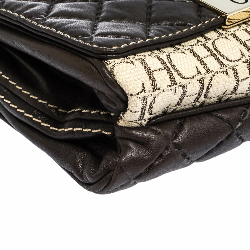 This adorable flap bag by Carolina Herrera is crafted from dark brown, quilted leather and monogram coated canvas. Highlighted with the gold-tone brand label on the flap, it comes with a chainlink and leather shoulder strap and a canvas-lined interior with a slip pocket on the inside.