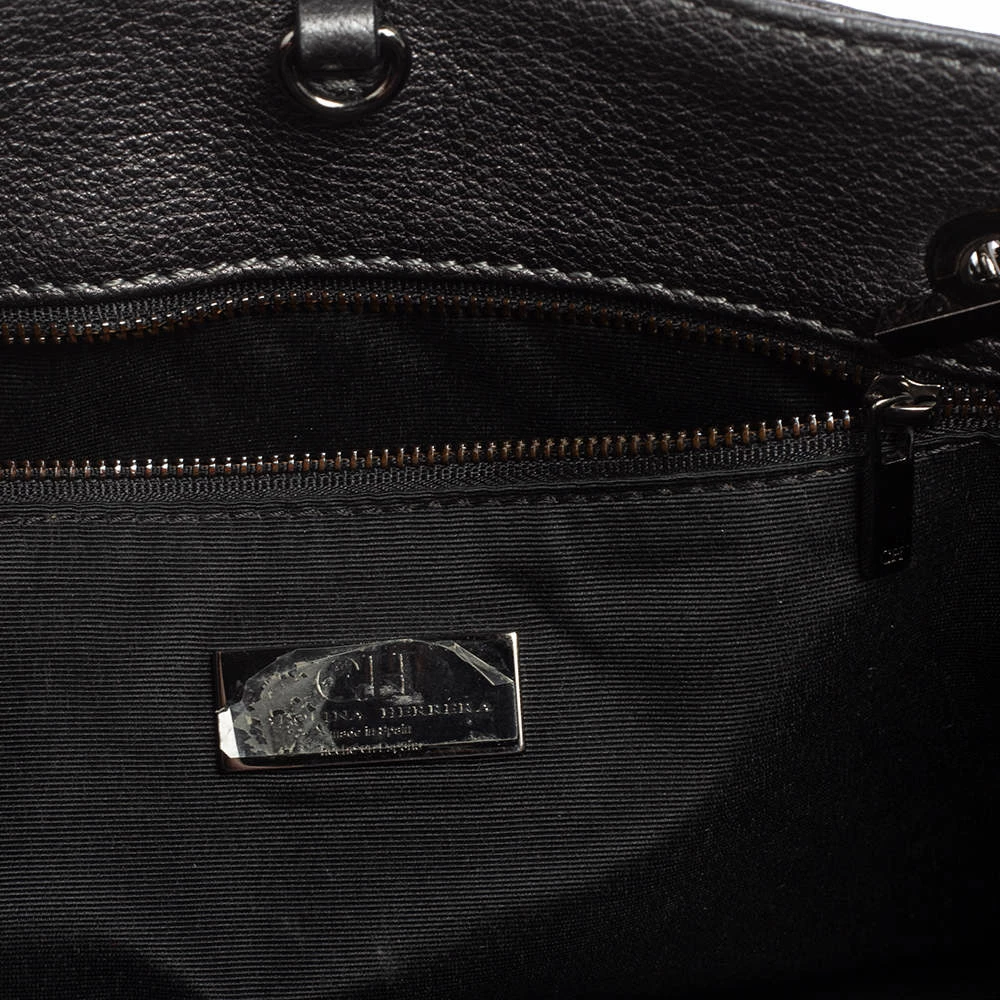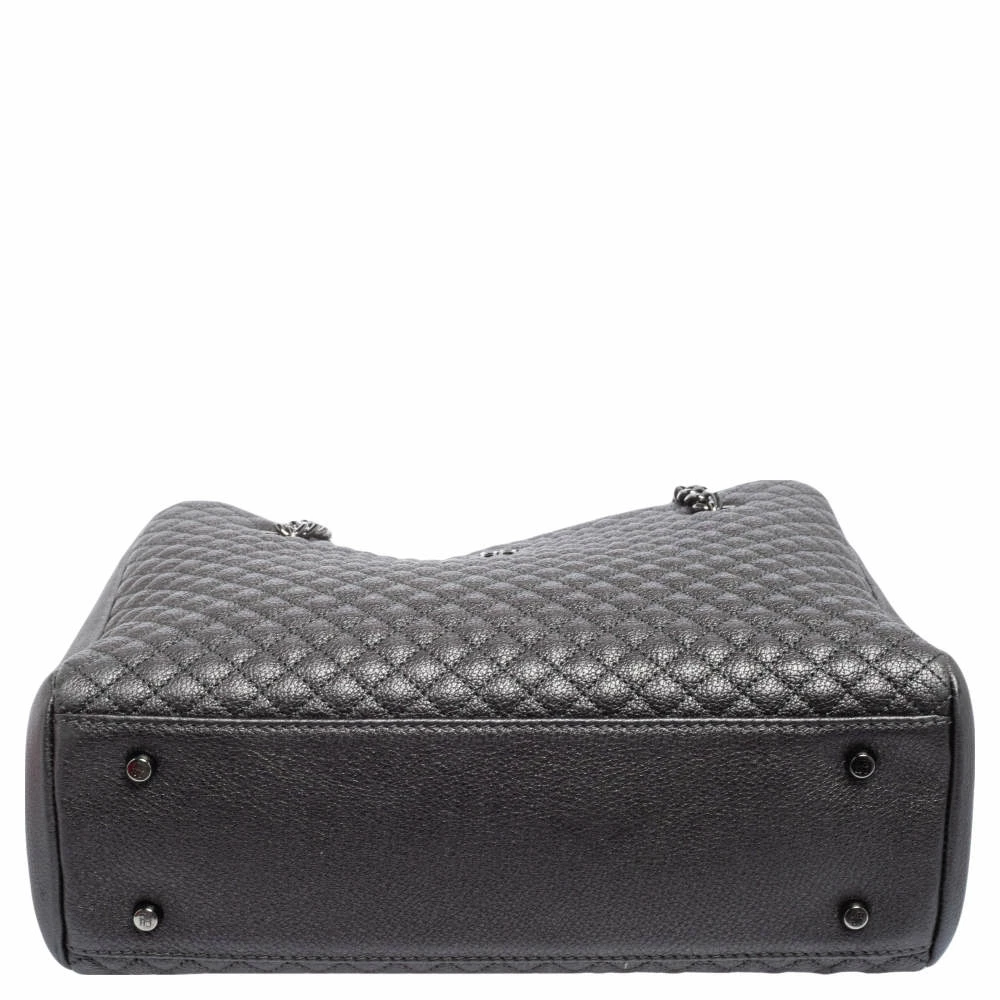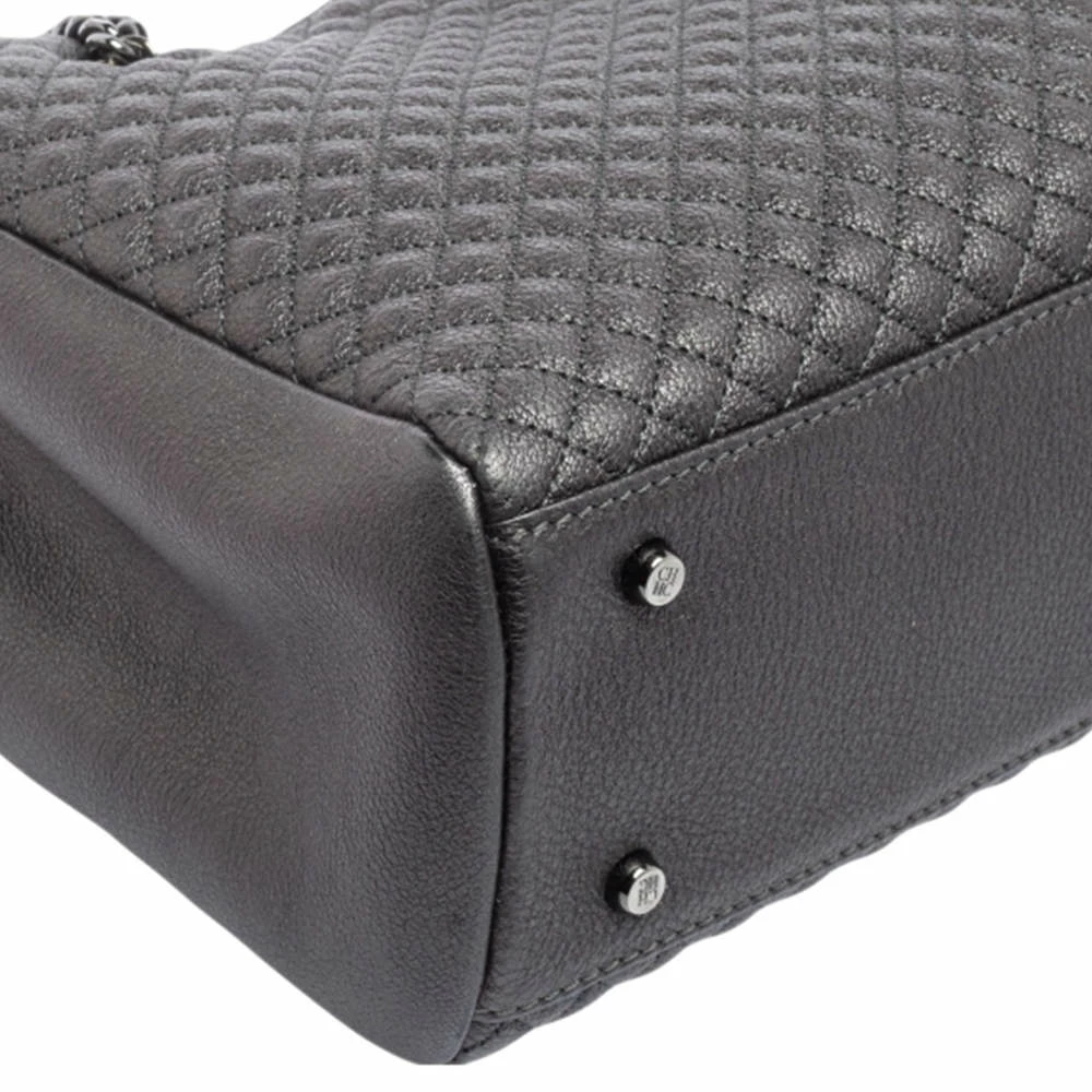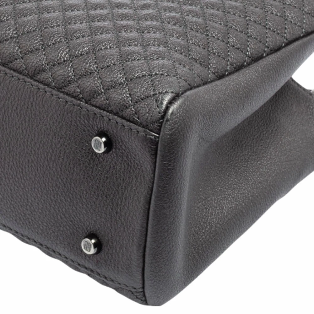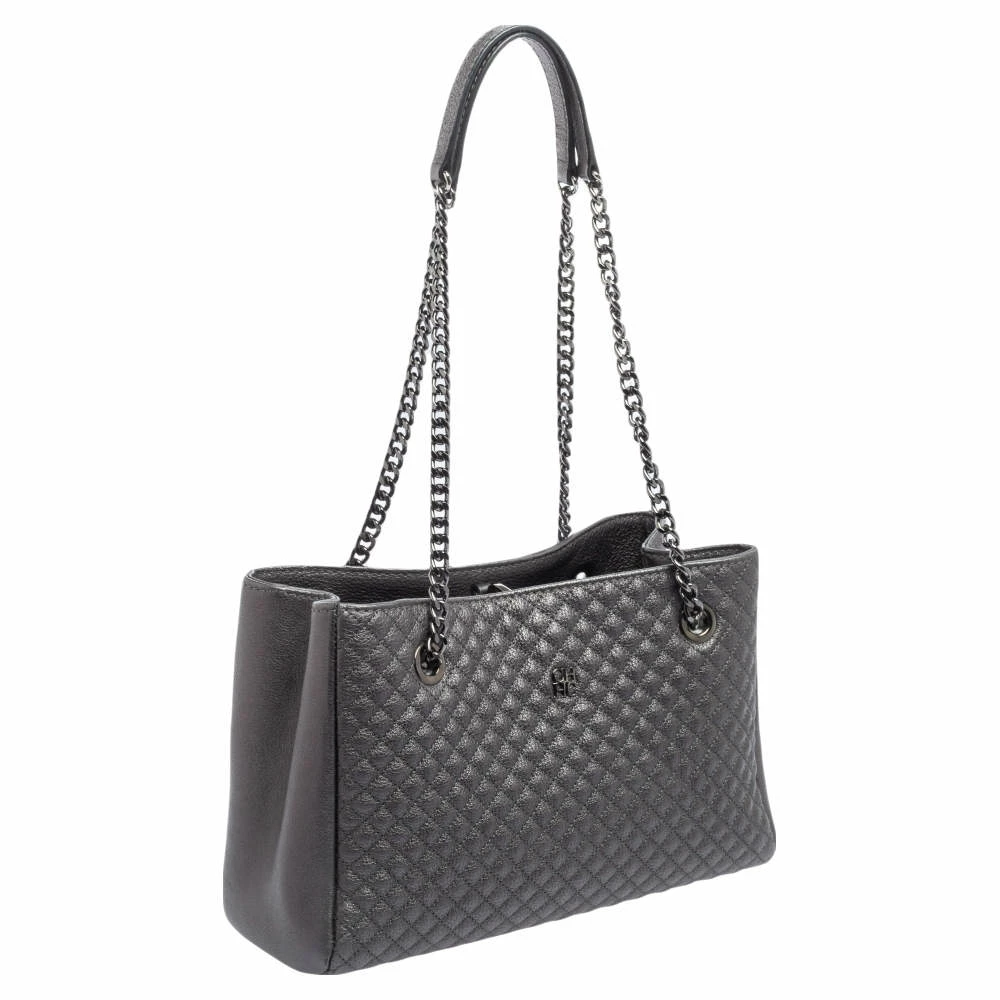 Carolina Herrera brings you this gorgeous tote that carries a fabulous structure and a classy design. It flaunts a dark grey hue with a quilted exterior, a spacious fabric interior, and protective metal feet. You can use the two chain handles to parade this stylish tote.